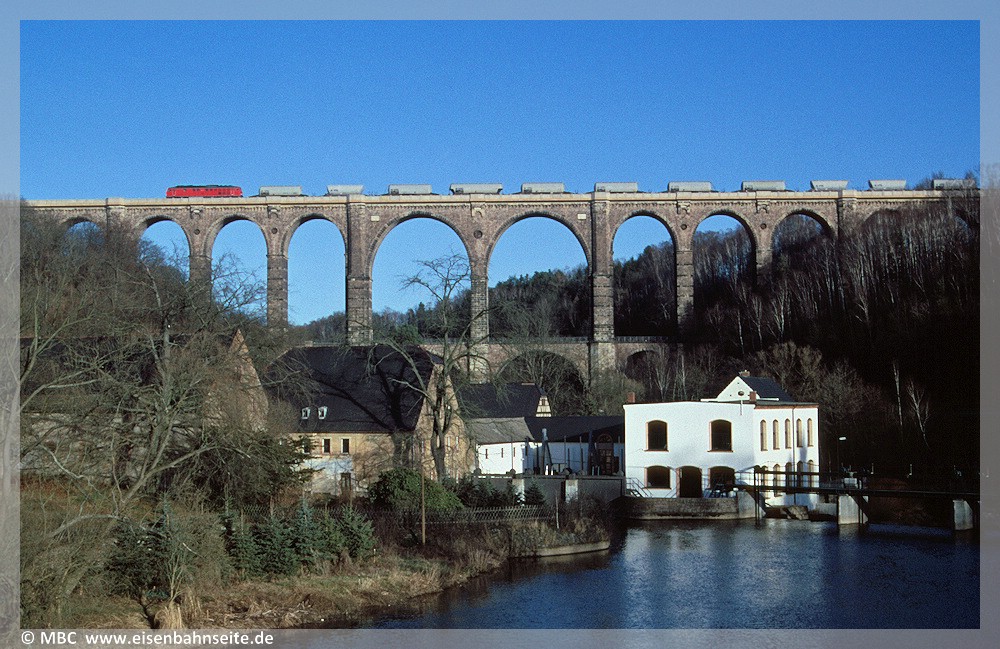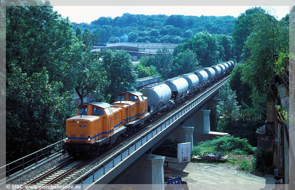 Ganzzugverkehr übernommen. Am 10.06. waren die ex-Bundesbahn-V100 V 130.1 und V 130.2 mit dem Leerzug DGS 80782 nach Blankenburg (Harz) Nord auf der Chemnitztalbrücke im Stadtteil Furth zu sehen.