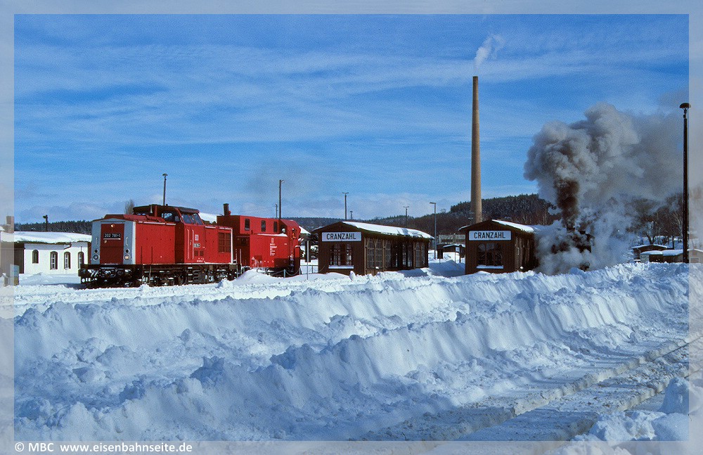 Zuvor kam 202 781 Lz des Weges. Die wird wohl mal wieder den Wolkensteiner Pflug ins Gebirge schieben … Auf der „Möbelrampe“ wurde „CPC“ angetroffen und von 202 781 in Kenntnis gesetzt. Kurzentschlossen ging es gemeinsam ins Gebirge. Als wir vor Ort eintrafen, war das Gespann bereits auf dem Rückweg von Bärenstein (Kr. Annaberg) nach Cranzahl. Hier am BÜ Richterstraße bei Cranzahl (10.03.).