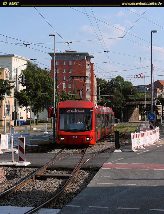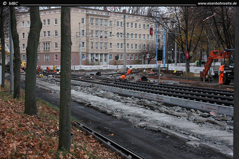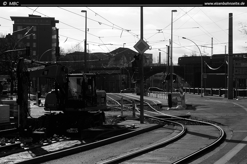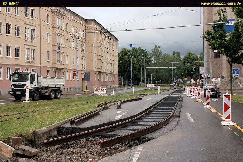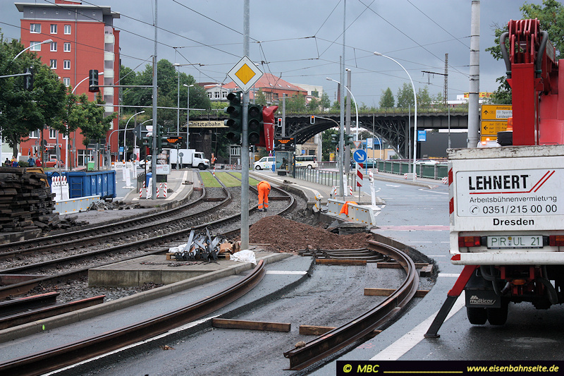 6a: Nun betrachten wir noch den Einfädelungspunkt an der Aue/Reichsstraße bzw. an der Haltestelle Gustav-Freytag-Straße. Der Zustand vor dem Weicheneinbau am 14.07.2015.