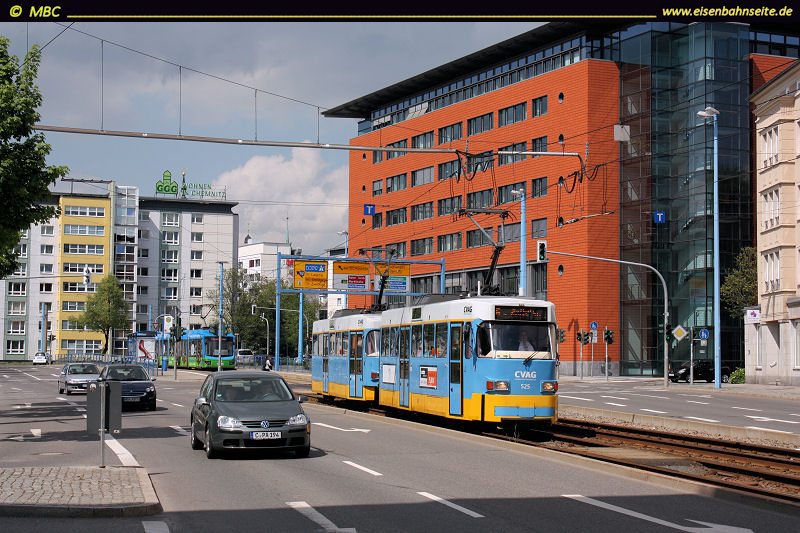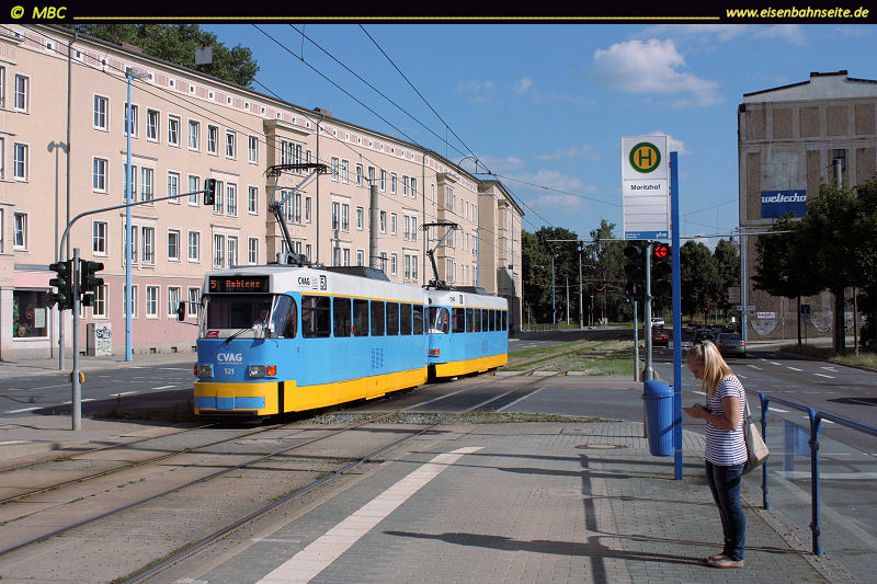 1a: Hier zunächst der Normalzustand vor der Sanierung. 525+526 verlassen gerade die Haltestelle Moritzhof stadtauswärts, Variobahn 909 ist Richtung Innenstadt unterwegs. Das Bild entstand im Mai 2012, zwischenzeitlich wurde der Oberbau an dieser Stelle bereits durch „Rasengleis“ ersetzt.