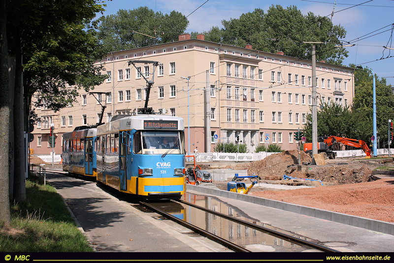 5a: In Höhe Gleisdreieck Annenstraße sammelte sich Wasser im Baugleis. 531+532 rollen davon unbeeindruckt gen Altchemnitz, 24.08.2015.