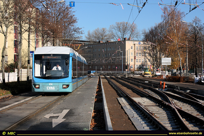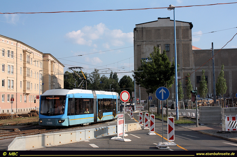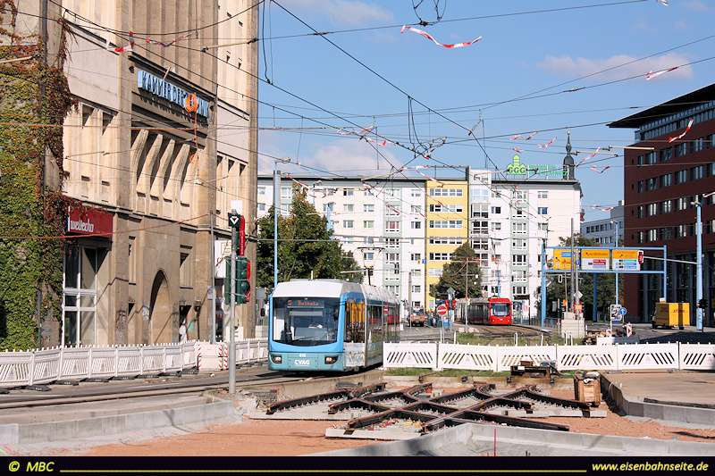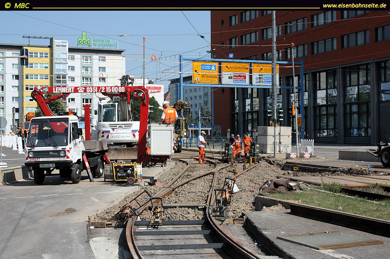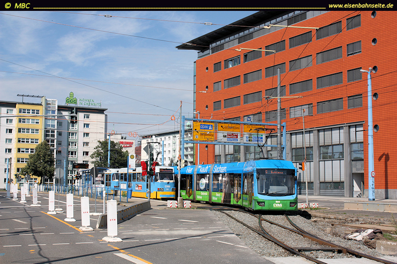 Die Straßenbahn fährt auf der Straße? Klar, wo sonst! Aber in Chemnitz ist das garnicht so selbstverständlich. Schließlich ist hier ein Großteil der Schienen auf eigenem Gleiskörper, zwischen den Autofahrbahnen, angelegt. So auch auf bzw. zwischen der Annaberger Straße. Die Erneuerung des Oberbaus inklusive der Beseitigung von Flutschäden zwang im Bereich Moritzstraße/Annenstraße/Aue zu einer besonderen Lösung. Da die Bauarbeiten mehrere Monate in Anspruch nahmen, und das Netz an dieser Stelle keine adäquate Umleitung der Linien 5, 6 und 522 (heute C11) ermöglicht, wurde eigens ein Interimsgleis angelegt. Dazu wurde die Annaberger Straße (die an dieser Stelle seit Inbetriebnahme des Innenstadtrings/Reichsstraße keine Bundesstraße mehr ist) zwischen Moritzstraße und Aue gesperrt, und das Gleis in die stadtauswärtige Fahrbahn zementiert. Dieses rund vier Monate währende Kuriosum soll nun anhand einiger Bilder vorgestellt werden. Weitere Erläuterungen finden sich in den Bildunterschriften. (Die Bilder sind nicht chronologisch, sondern in Vergleichsreihen am jeweiligen Standort sortiert.)