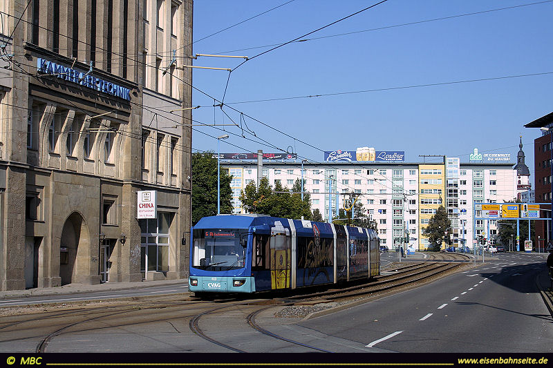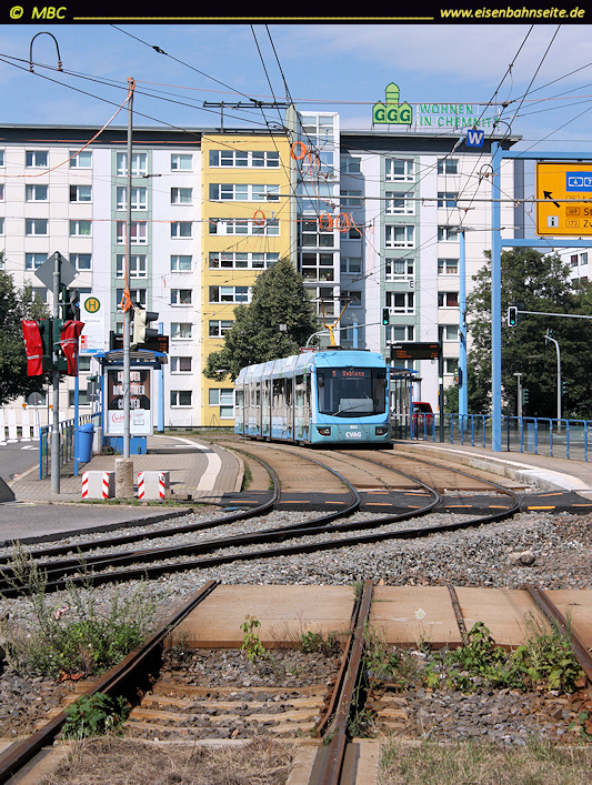 3a: Wenige Meter weiter stadtauswärts befindet sich das Gleisdreieck an der Ecke Annenstraße, die Verbindung zur Reitbahnstraße. 613 fährt auf der Annaberger weiter in Richtung Altchemnitz (26.09.2009).
