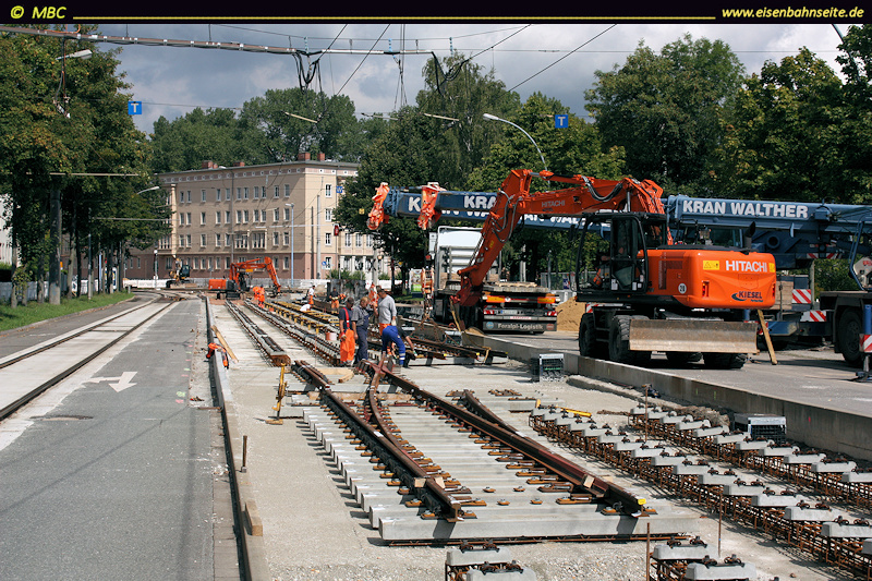 1c: Die provisorische Umleitung hat man eingleisig ausgeführt. An den Überleitungen war also jeweils eine Weiche notwendig. Hierfür wurden die beiden Weichen des Gleiswechsels zwischen Annenstraße und Aue wiederverwendet. Am 18.07.2015 war die Weiche am Moritzhof schon eingebaut, muss aber noch gestopft werden.