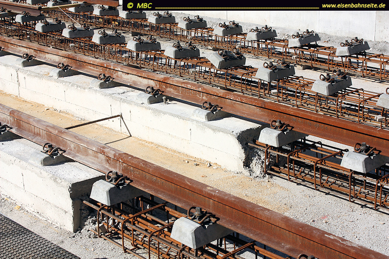 3b: Am 30.09.2015 waren die alten Gleise längst entfernt und der Tiefbau weitgehend abgeschlossen. Am Abzweig liegen schon neue Weichenteile bereit.