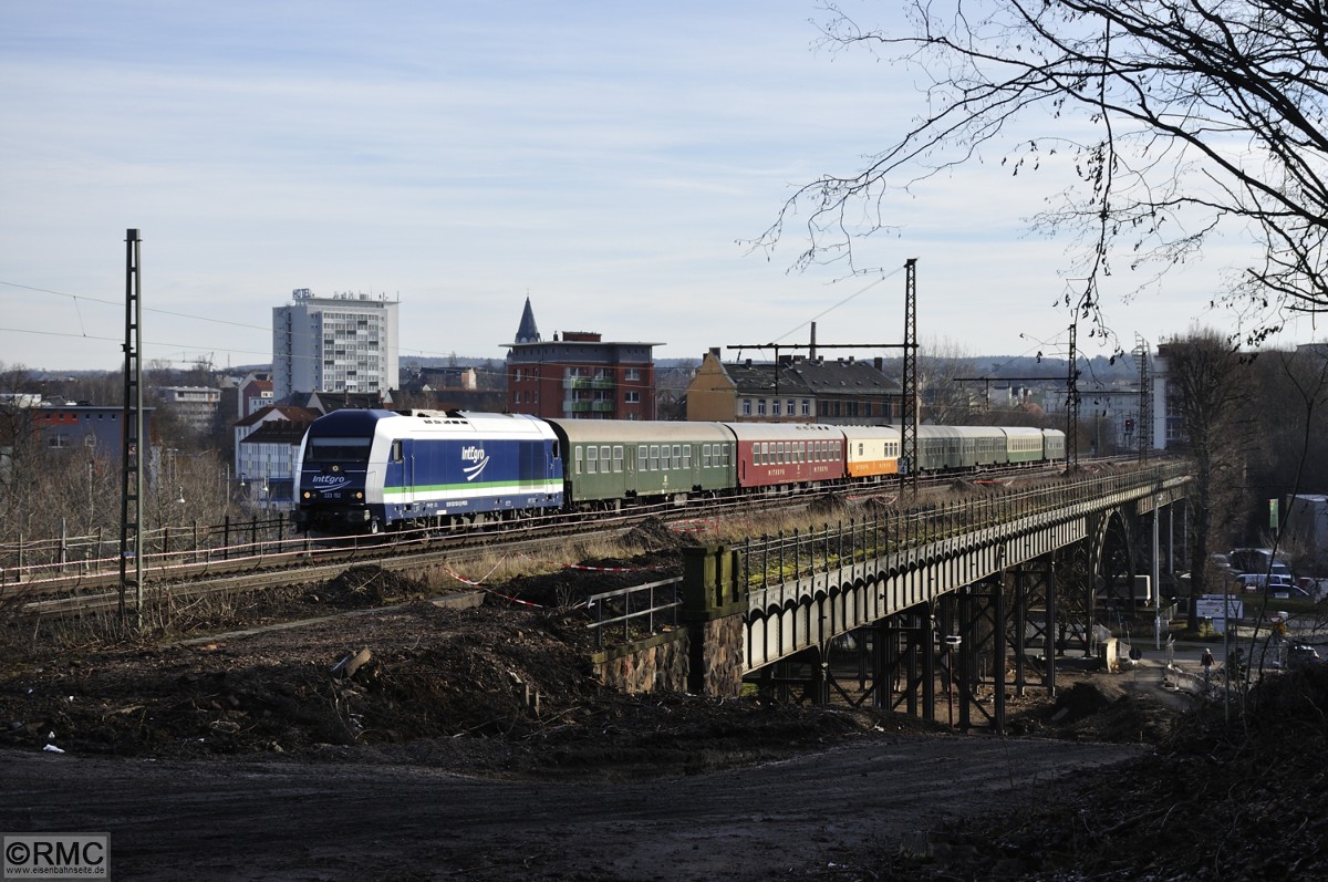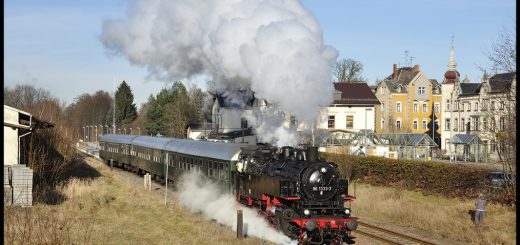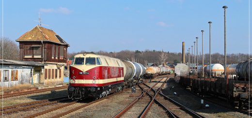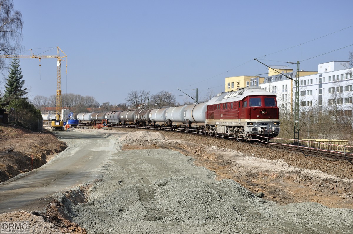 1440 711 / 211 überqueren am 01.03.2020 mit RE Dresden Hbf – Hof Hbf die Augustusburger Straße / Uferstraße. Inzwischen sind alle nicht mehr benötigten Brückenteile verschwunden. Nur noch die alten Pfeiler sind vorhanden. Wenige Meter vor der Beckerbrücke befindet sich am 26.03.2020 die NRE 232 426 mit Kesselzug von Großkorbetha zum GTL Hartmannsdorf (b Chemnitz). An dieser Stelle wird der Haltepunkt Chemnitz Mitte neu errichtet.