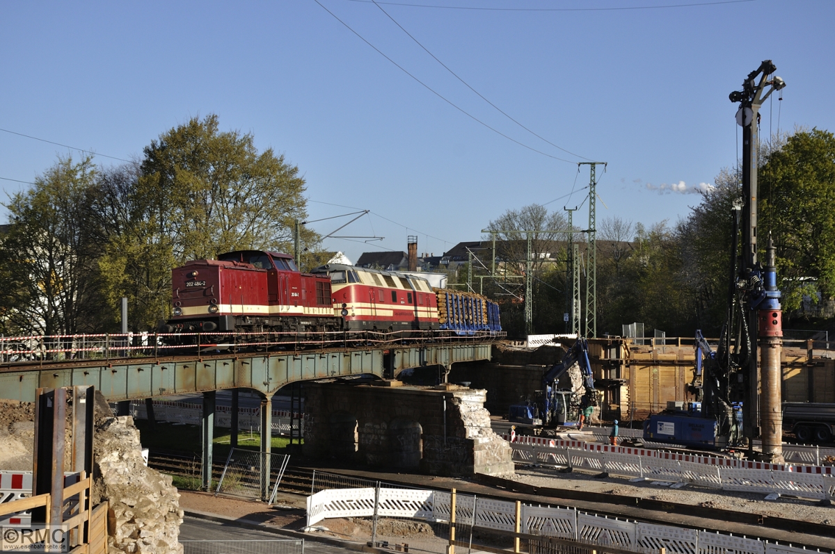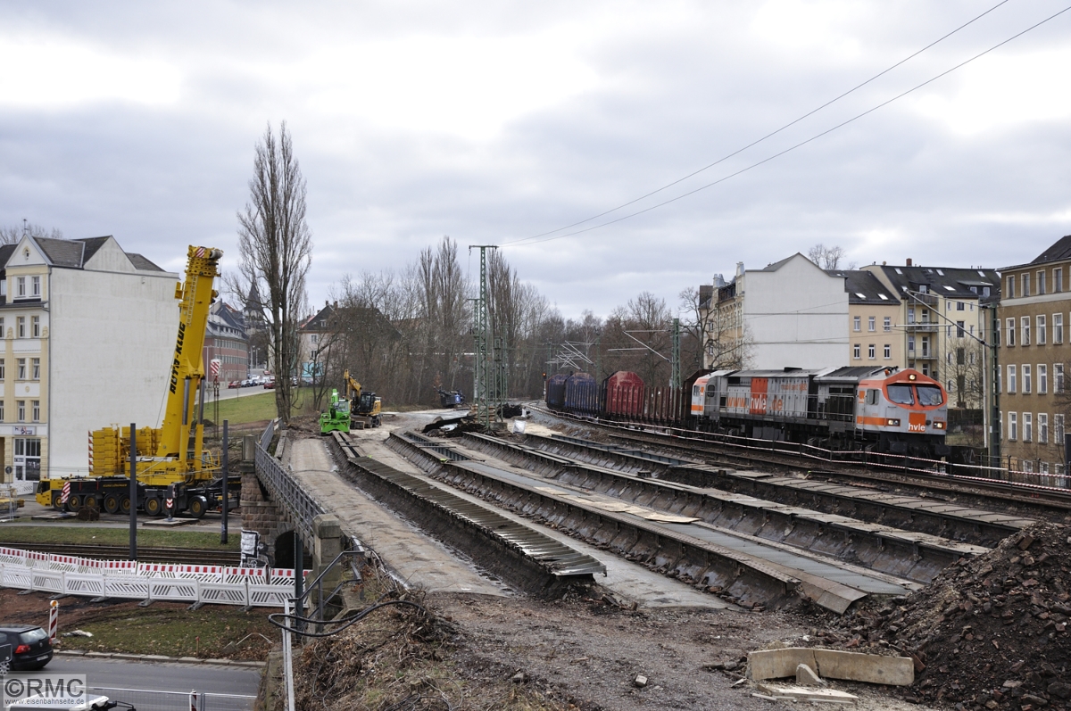 Ebenfalls durch einen Neubau ersetzt wird die Straßenbrücke Zschopauer Straße. Hier wurde das Streckengleis vermutlich wegen Baufreiheit in die Mitte verschoben. Am 01.04.2020 konnte die PRESS 110 043 mit leeren Autozug von Nymburk Hlavni Nadrazi nach Werdau von der Brücke beobachtet werden.IntEgro/PRESS 223 152 befindet sich am 16.04.2020 kurz vom Hp Chemniz Mitte auf der Brücke Neefestraße, welche ersatzlos aufgegeben und verfüllt wird.Die alten Pfeiler der EÜ Augustusburger Straße / Uferstraße sind inzwischen teilweise abgebrochen, als am 21.04.2020 CLR 202 484 und 228 321 mit Holzzug von Freiberg (Sachs) nach Plattling über die letzten beiden alten Brückenteile fährt. Diese werden bis März 2021 noch befahren.