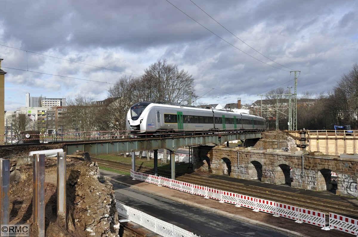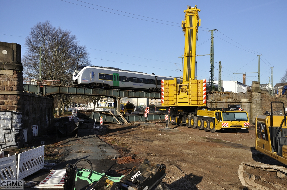 MRB 1440 834 / 334 war am 08.02.2020 von Dresden Hbf nach Zwickau (Sachs) Hbf unterwegs, und überquert hier gerade die Augustusburger Straße. Der Kran war die Tage vorher mit dem herausheben der alten Brückenteile beschäftigt.Am 08.02.2020 waren an der Neefestraße / Stollberger Straße schon etliche alte Brücken demontiert. MRB 1440 716 / 216 hat gerade mit RB Zwickau (Sachs) Hbf – Dresden Hbf den Haltepunkt Chemnitz Mitte verlassen, welcher an dieser Stelle aufgeben wird.