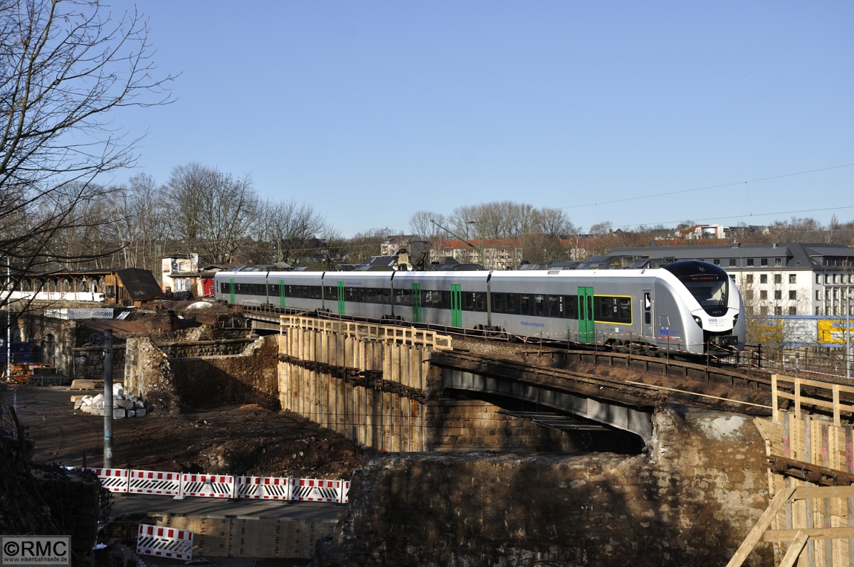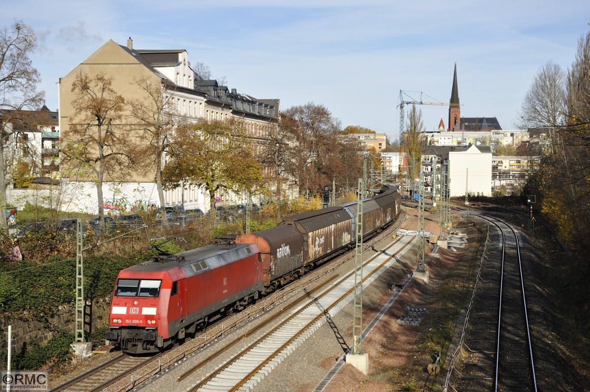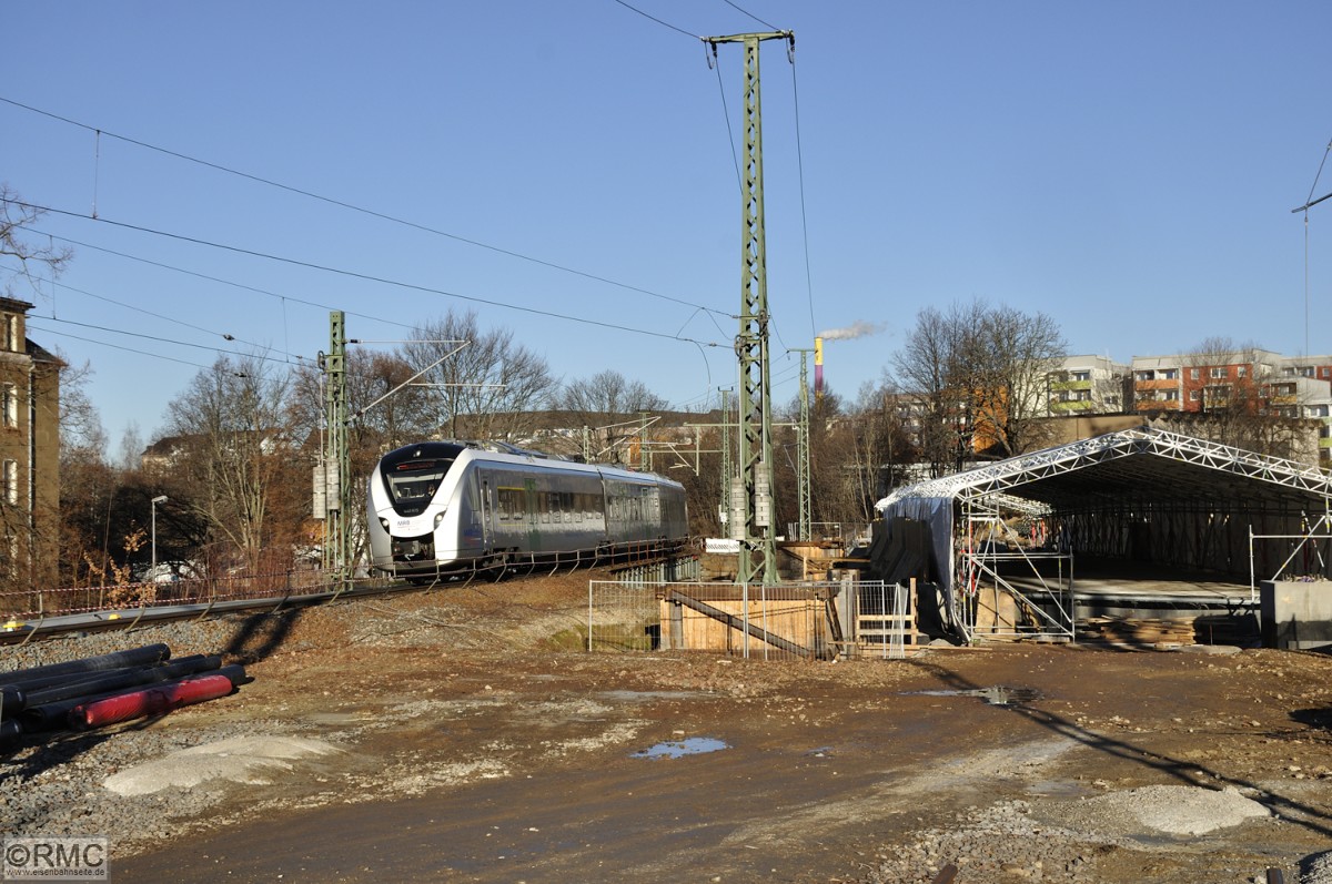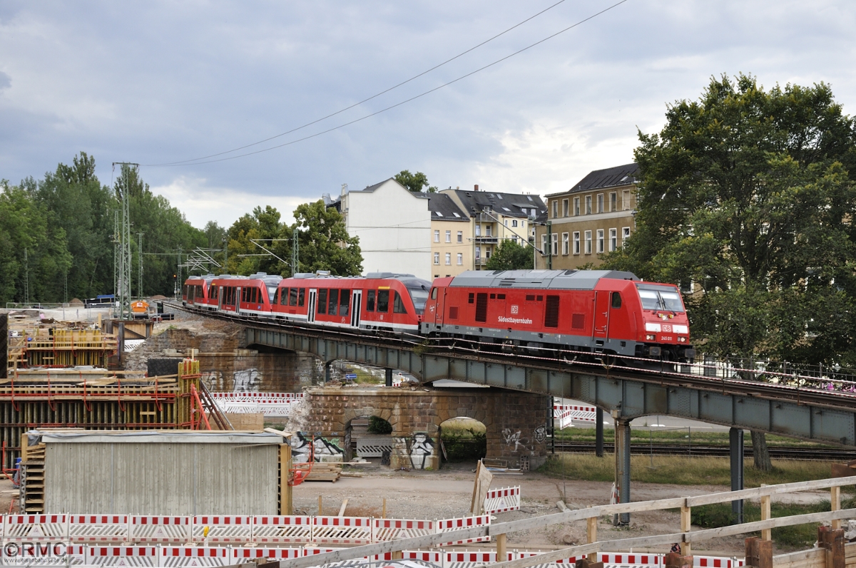 Dieser Blick wird inzwischen von einer langen Lärmschutzwand verhindert. Am 27.10.20 war von den Wänden noch nichts zu sehen, als 233 511 mit den Gipszug von Chemnitz Küchwald nach Großkorbetha den Haltepunkt Chemnitz Mitte gerade hinter sich gelassen hat.Bis kurz nach der Bernhardstraße reicht am 18.11.2020 das neue Gleis und die Oberleitungsmasten Richtung Chemnitz Hbf. Rechts das Gleis geht zum Bahnhof Chemnitz Süd. 152 005 ist mit „VW-Zug“ von Braunschweig Rbf nach Zwickau (Sachs) Hbf unterwegs.Die erste neue Brückenteile über die Uferstraße / Augustusburger Straße waren am 19.12.2020 fast fertig gestellt. Links fährt MRB 1440 835 / 335 mit RB von Dresden Hbf nach Zwickau (Sachs) Hbf über die noch alte Brücke. Im März soll das Gleis dann über die neue Brücke verschwenkt werden. Dann werden auch die letzten beiden über 100 Jahre (!) alten Brückenteile abgerissen, und durch einen Neubau ersetzt.