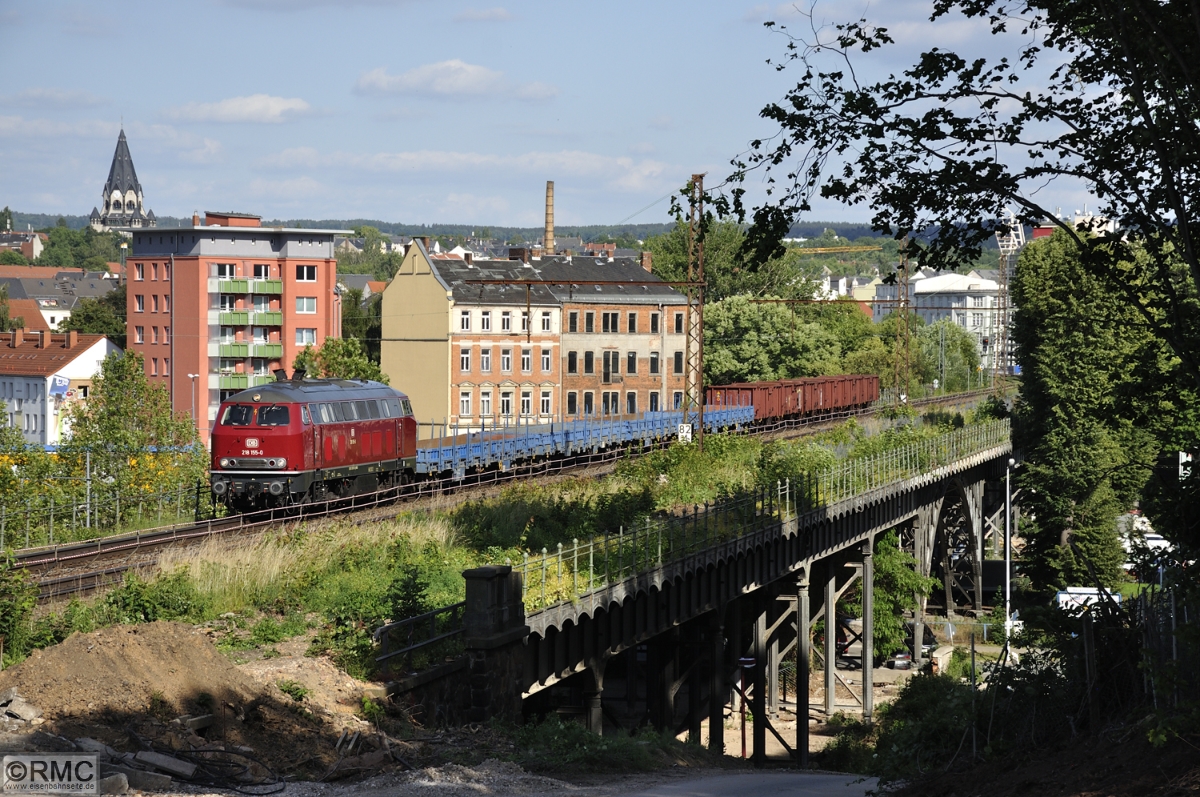 Mit der „leeren Kohle“ Cranzahl – Leipzig-Engelsdorf Gbf überfährt PRESS Mietlok 218 155 am 23.06.2020 das Chemnitztalviadukt welche die Annaberger Straße, den Fluss Chemnitz und die Beckerstraße überquert. Daher auch der Name „Beckerbrücke“.