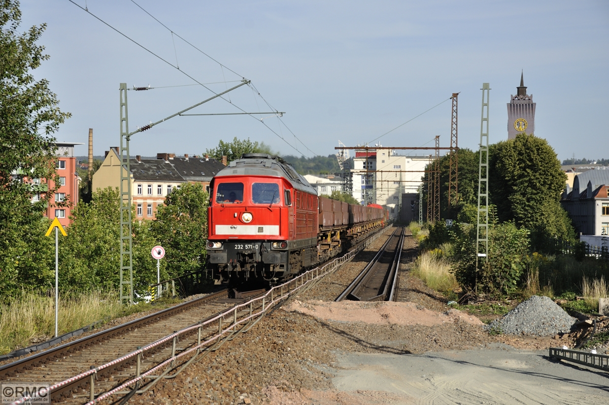 Augustusburger Straße am 25.07.2020. 245 011 überführte 3 Triebwagen der BR 640 (640 011 + 640 029 + 640 016) von Mühldorf (Oberbay) zum Anschl. Birkus (ex. RAW). Links erkennt man die inzwischen teilweise neu errichteten Brückenpfeiler.Am 30.07.2020 befindet sich 232 571 mit der Übergabe Chemnitz Süd – Zwickau (Sachs) Hbf auf der Beckerbrücke zwischen Chemnitz Süd und Mitte.
