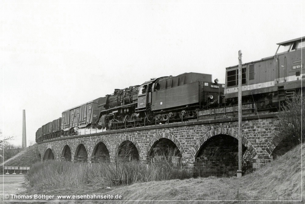 [23] Diese Aufnahme vom April 1978 zeigt das komplette neunbogige Bauwerk, das gerade von einem umgeleiteten Güterzug Richtung Zwickau befahren wird. Vorspannlok ist die heute noch aktive 110 101. Das Interesse des Fotografen galt seinerzeit eher der Zuglok 50 1158. Der zweite Bogen von rechts ist mit sechs Metern lichter Weite etwas breiter als die anderen.[24] Der Zwickauer Traditionseilzug war in der ersten Hälfte der 1990er-Jahre regelmäßiger Gast auf der Industriebahn. Hier zieht der sächsische Rollwagen, 38 205, den Zug über das Bornaer Viadukt (6/1992). Der Wartburg des Fotografen steht im Vordergrund.[25] Ein Kohlenleerzug donnert am Nachmittag des 6. April 2000 über die Bornaer Brücke. Rechts sieht man die gepflasterte Zufahrt zur ehemaligen Ladestelle.[26] Die Beseitigung einiger Bäume auf der Südseite ermöglichte ab 2018 seit vielen Jahren wieder einen guten Blick auf das gesamte Viadukt. Das Brückengeländer hat jedoch durch die Rodung arg gelitten.