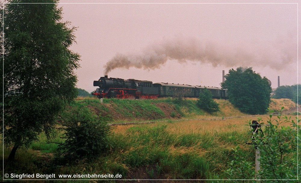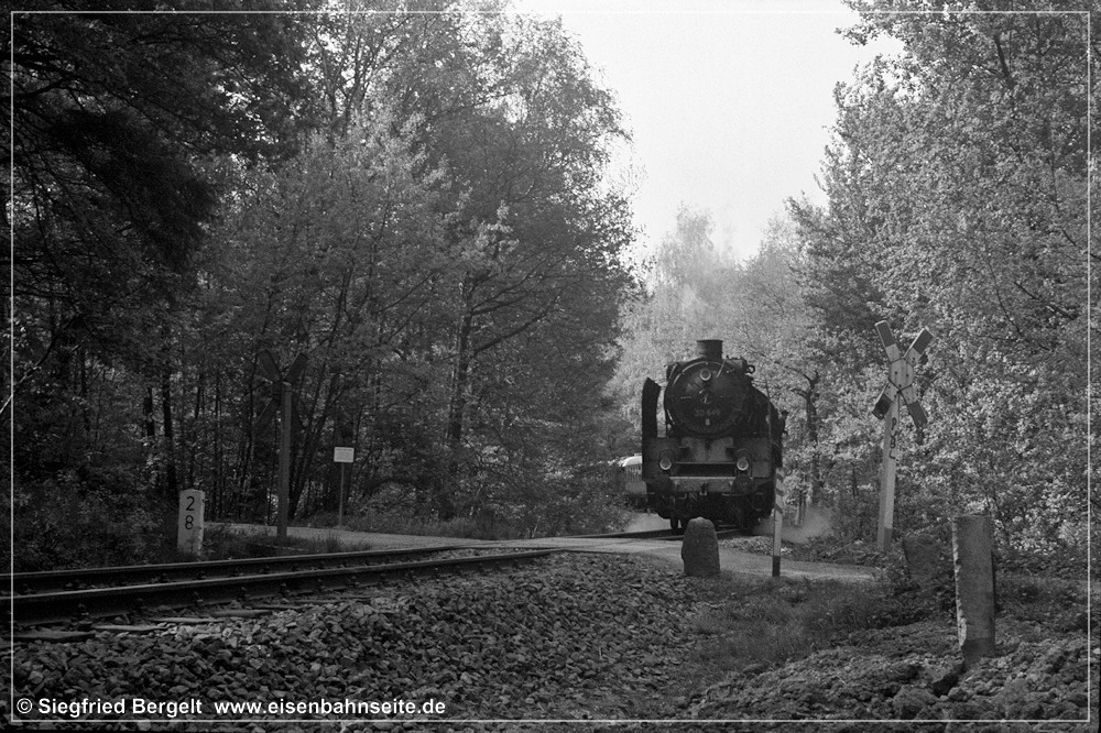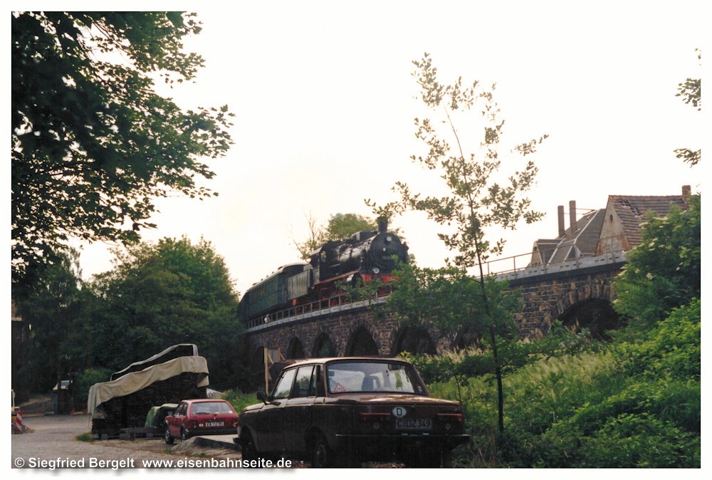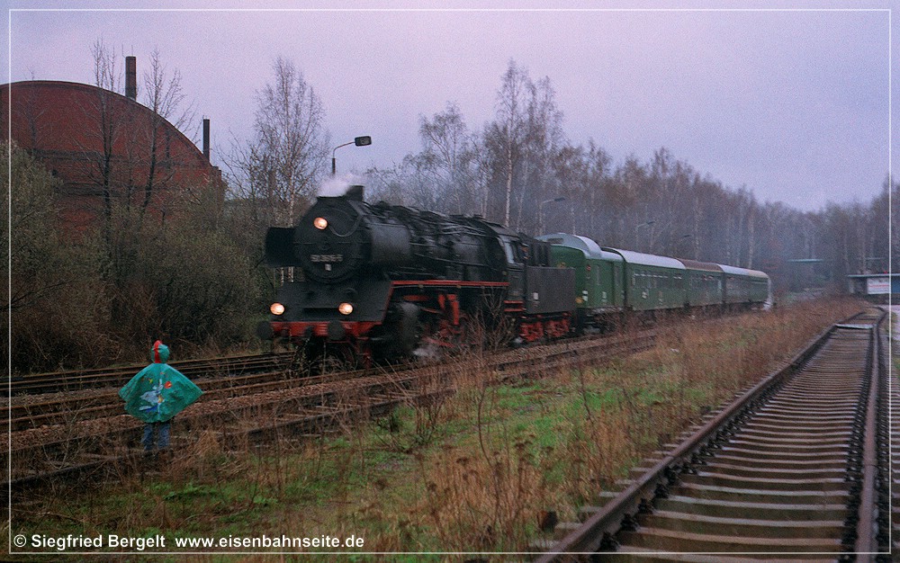 [37] An einem Wochenende Mitte 1993 war der Traditionseilzug einmal wieder, auf dem Weg von Zwickau nach Chemnitz, in Wüstenbrand links abgebogen. Meine kleine Schwester und ich verfolgten gespannt die Vorbeifahrt von 50 849, während der Vater den Auslöser betätigte. Meine größere Schwester wartete hier auch manchmal unfreiwillig auf Züge, denn sie musste den kleinen Bruder an manchem Ferientag zum „V 60 gucken“ sicherheitshalber begleiten. Zur Sicherung des Übergangs genügten zwei Warnkreuze damals völlig.