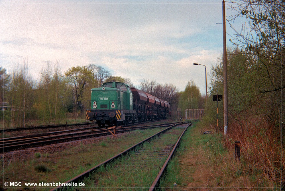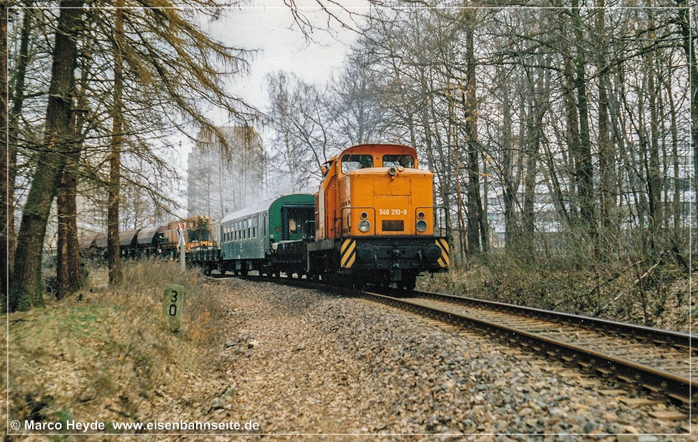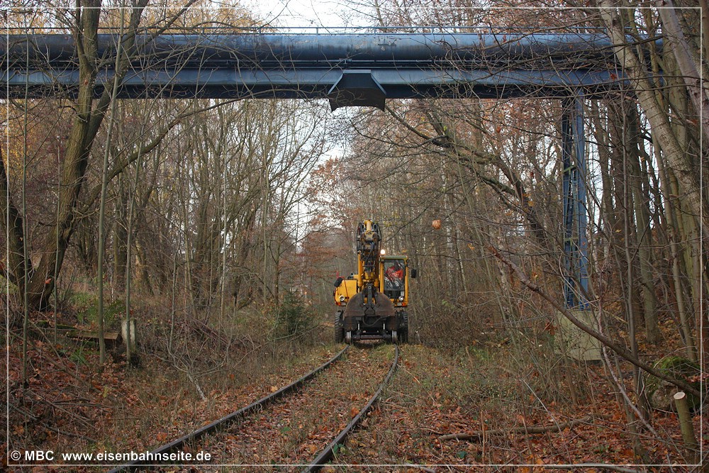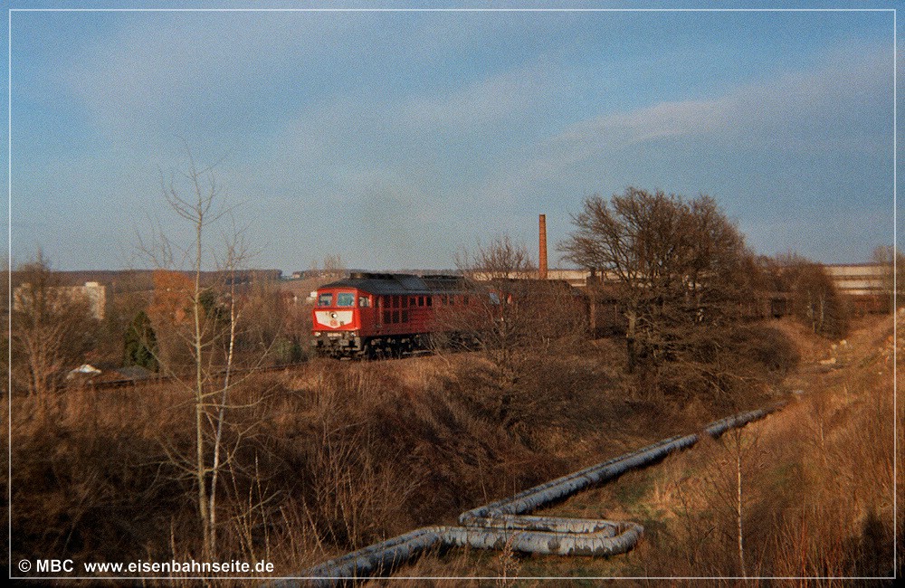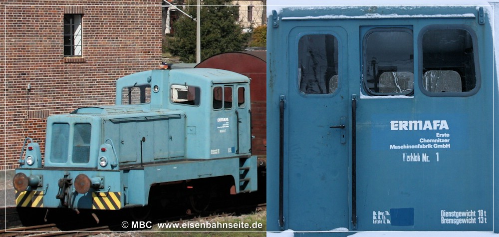 [31] 106 9304 der ITL hat mit dem Fcs-Zug im Crimmitschauer Wald Gleise eingeschottert und ist soeben nach Borna zurückgerollt. Links zu sehen ist die Anschlussweiche A1, welche in Schlüsselabhängigkeit mit Weiche A2 (rechts) stand. Dahinter sieht man die mittels Gleistor gesicherte Werkszufahrt. Nach einer Spitzkehre gelangte man zu den Werksanlagen. Im Vordergrund liegt das stumpf endende Zuführungsgleis A1. In seiner Lage befand sich vor 1970 das Streckengleis.[32] Im Werksgelände der ERMAFA-Gießerei existieren noch einige Gleisreste. In Bildmitte ist der Werklokschuppen zu sehen. Links erkennt man die Zufahrt über die Burgstädter Straße.[33] Als Rangiergerät stand dem VEB ERMAFA Karl-Marx-Stadt in Borna eine eigene Werklok vom Typ V 10 B zur Verfügung. Dabei handelte es sich um LKM Nr. 252462 (Bj. 1966), welche seit 1999 in Chemnitz-Hilbersdorf zu Hause ist.[34] Am km 2,3 CWd überquert eine Fernwärmeleitung die Bahn. Der Zweiwegebagger verheißt nichts Gutes für die Zukunft der Gleise.