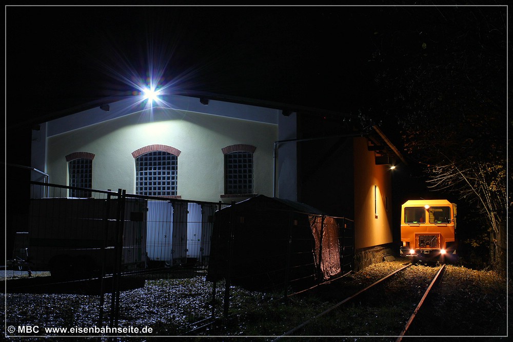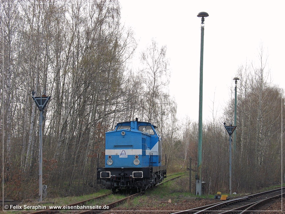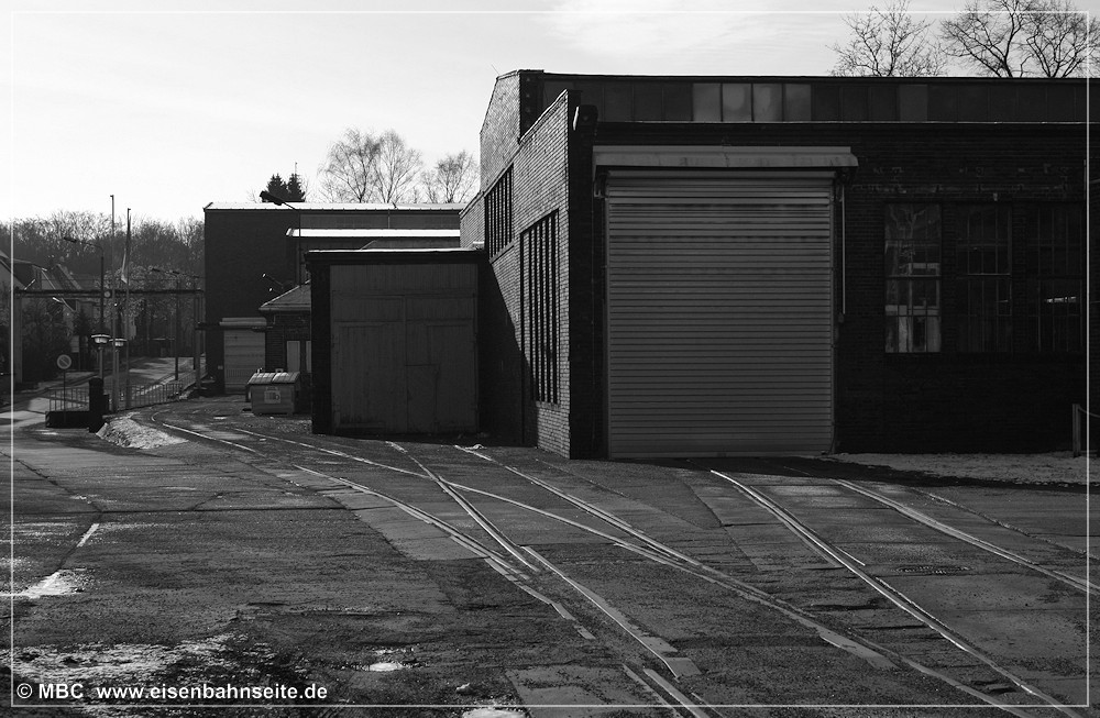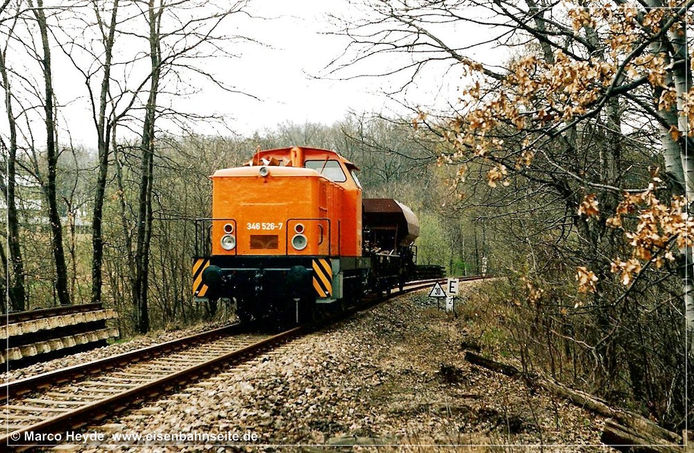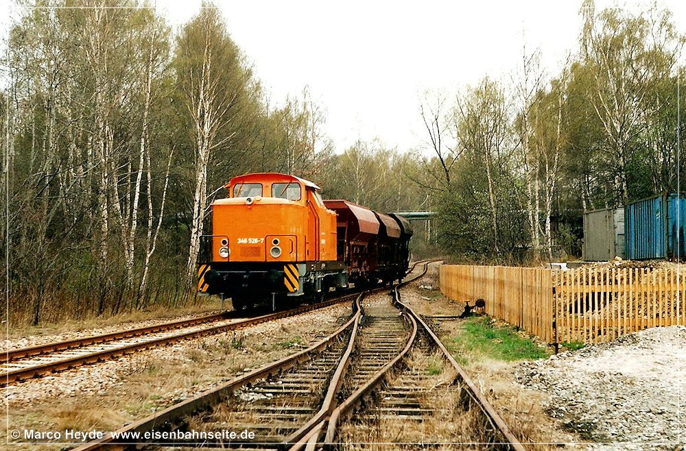 [31] 106 9304 der ITL hat mit dem Fcs-Zug im Crimmitschauer Wald Gleise eingeschottert und ist soeben nach Borna zurückgerollt. Links zu sehen ist die Anschlussweiche A1, welche in Schlüsselabhängigkeit mit Weiche A2 (rechts) stand. Dahinter sieht man die mittels Gleistor gesicherte Werkszufahrt. Nach einer Spitzkehre gelangte man zu den Werksanlagen. Im Vordergrund liegt das stumpf endende Zuführungsgleis A1. In seiner Lage befand sich vor 1970 das Streckengleis.[32] Im Werksgelände der ERMAFA-Gießerei existieren noch einige Gleisreste. In Bildmitte ist der Werklokschuppen zu sehen. Links erkennt man die Zufahrt über die Burgstädter Straße.[33] Als Rangiergerät stand dem VEB ERMAFA Karl-Marx-Stadt in Borna eine eigene Werklok vom Typ V 10 B zur Verfügung. Dabei handelte es sich um LKM Nr. 252462 (Bj. 1966), welche seit 1999 in Chemnitz-Hilbersdorf zu Hause ist.[34] Am km 2,3 CWd überquert eine Fernwärmeleitung die Bahn. Der Zweiwegebagger verheißt nichts Gutes für die Zukunft der Gleise.