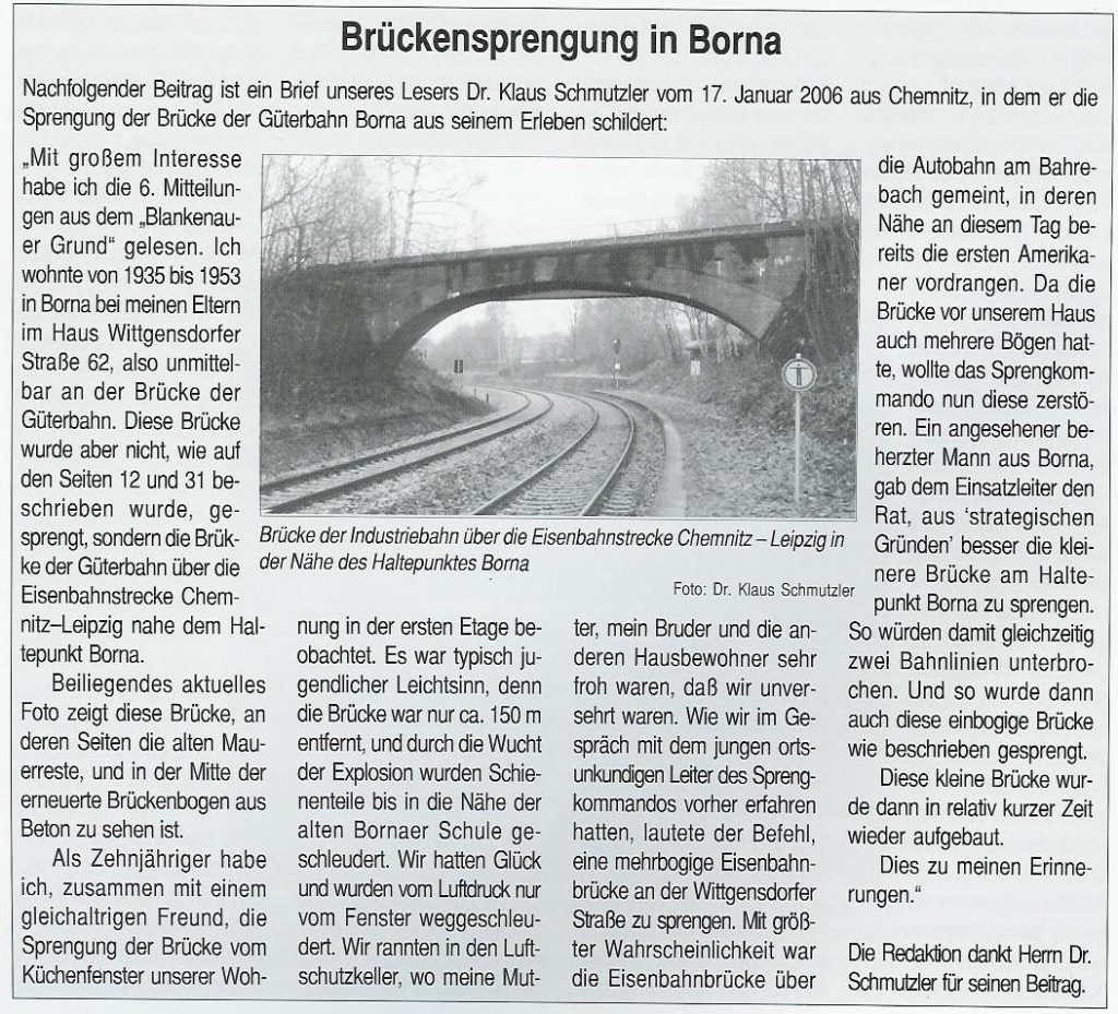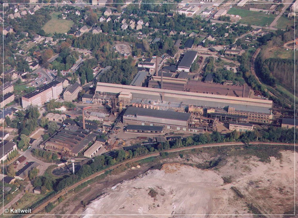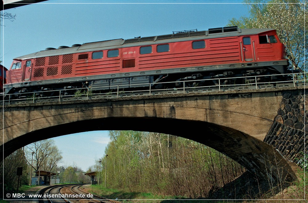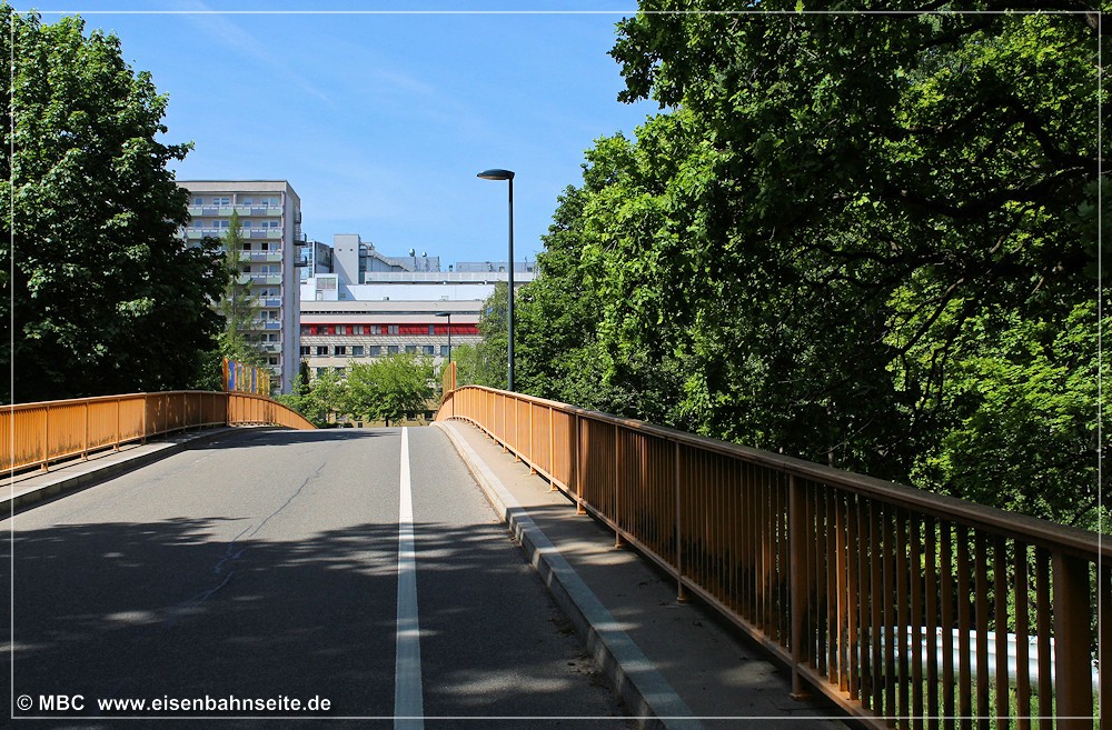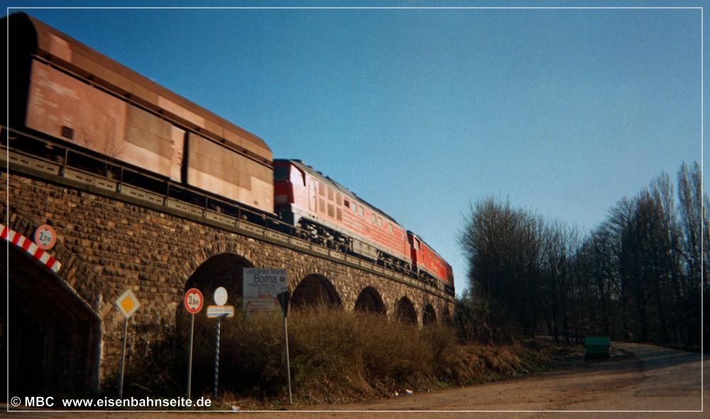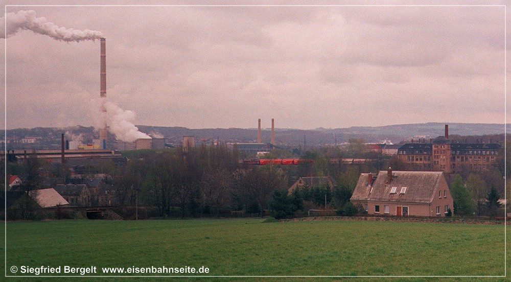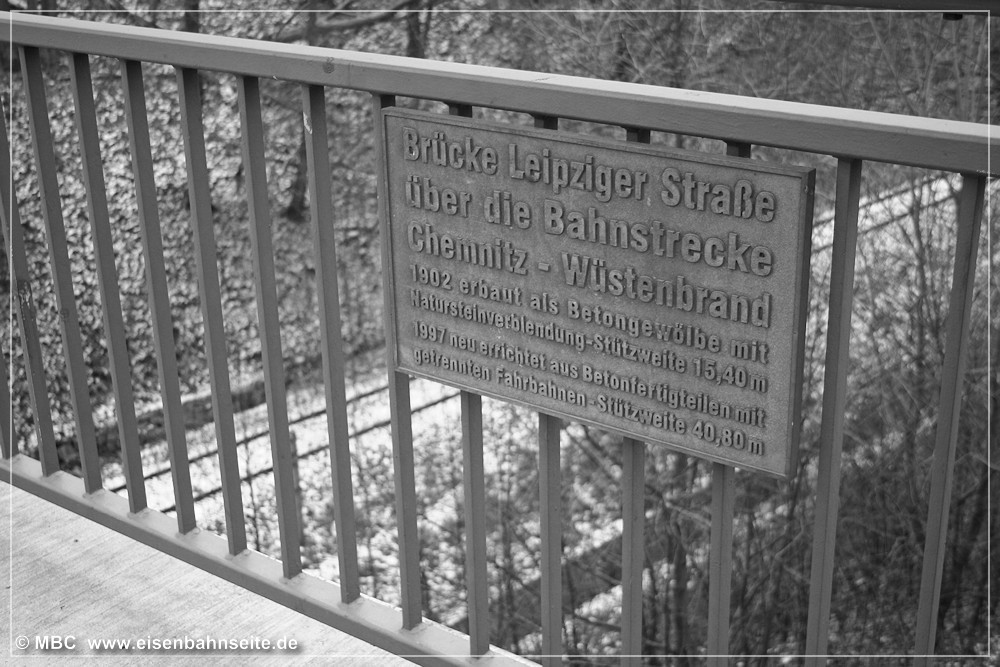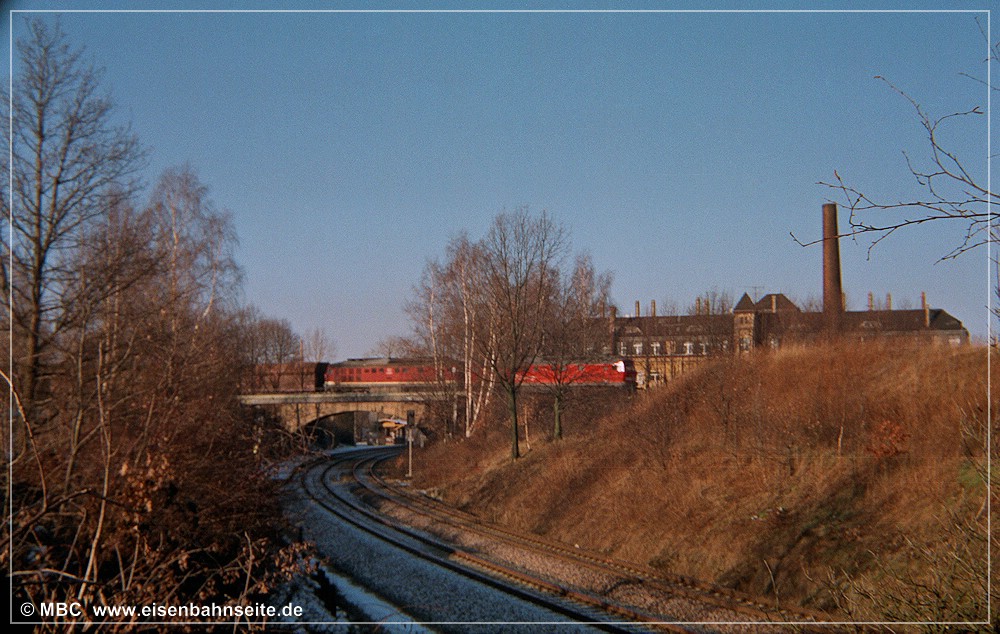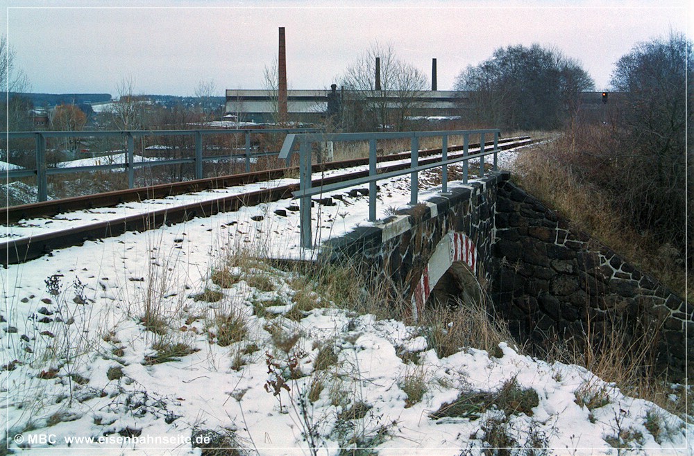 [10] Diese Luftaufnahme zeigt die CWd zwischen Einfahrsignal und Einfahrvorsignal von Küchwald. In einem stetig steigenden Linksbogen verläuft die Trasse gen Westen. Das Zentrum des Bildes dominiert die 1915 errichtete Stahlformgießerei der Firma Eisengießerei G. Krautheim. Teile des Werks, u. a. die große Halle, sind 2011 abgerissen worden. Die Gießerei hatte einen Gleisanschluss, jedoch zweigte dieser von der WbC ab. Diese schwenkt im Rechtsbogen hinunter in das Chemnitztal nach Furth/Glösa. Im Vordergrund entstand in den 1990er-Jahren eine Formsanddeponie der Stahlgießerei, welche mittlerweile bewaldet ist.[11] Der nächste Industriekomplex kommt wenig später in Sicht. In Fahrtrichtung Wüstenbrand sehen wir rechts die Knopffabrik Petzold & Mäser, welche 1914 die Produktion aufnahm. Nach umfassender Sanierung in den Jahren 2018/19 birgt das Gebäude nun hochpreisige Lofts. Auf der Freifläche davor entstand eine weitere, unvermeidbare, Eigenheimsiedlung.[12] Die Wirtschaftswegquerung (km 1,31; 15 m) ist als Gewölbebogen aus Naturstein ausgeführt. Der Zustand im Dezember 2003 lässt auf erst kürzlich vorgenommene Ausbesserungen an Geländer und Mauerwerk schließen. Der überquerte Weg verband die Sandstraße einst mit dem Bauerngut Franke. Rechts im Hintergrund ist das Einfahrvorsignal von Küchwald ersichtlich. [13] Nun blicken wir vom „Bornaer Berg“ in Richtung Südosten und erkennen links die Stahlgießerei (dahinter das Heizkraftwerk Chemnitz-Nord) und rechts die Knopffabrik wieder. Ein leerer Gipszug rollt auf Küchwald zu. Über der Lok (BR 232) und dem ersten Wagen ist das Befehlstellwerk 1 zu erkennen. Heute würde das frische Rot der fabrikneuen Selbstentladewagen (Talns 969) auch in laubloser Jahreszeit kaum noch durchschimmern.[14] Der Zwickauer Traditionszug, geführt von der Chemnitz-Hilbersdorfer 50 3616, ist am 13. Juli 1991 in km 1,4 CWd gen Westen unterwegs. 1993 ist die Maschine von der Deutschen Reichsbahn an den VSE verkauft worden. Rechts ist ein Einfahrvorsignal der KC-Linie zu sehen. Die Inbetriebnahme des neuen Stellwerks steht kurz bevor.[15] Im Frühjahr 2000 hatten der Baumbewuchs und die Halde schon merklich zugenommen. Zwei 232er bringen den leeren Kohlependel nach Profen. Links ist das Hochhaus des VEB NUMERIK, unweit des Bf Chemnitz-Glösa (WbC), zu sehen.