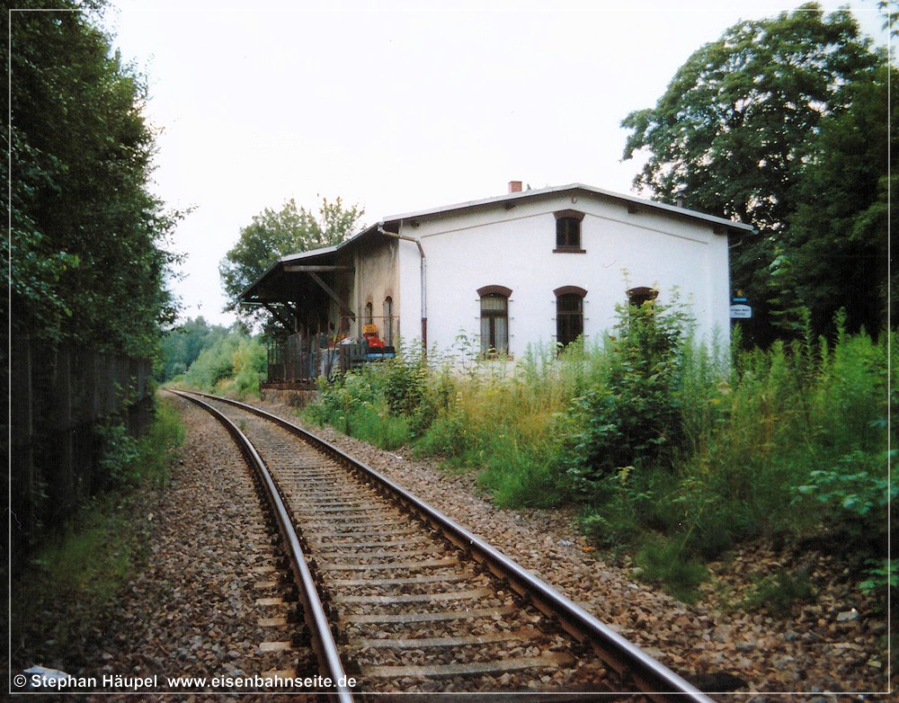 [38] Die V 60 war in den 90ern nicht wegzudenken. An einem Frühjahrstag 1993 mühte sich der „Goldbroiler“ 346 210 mit einem Arbeitszug der Bahnmeisterei von Altendorf nach Borna hinauf. Im Hintergrund sieht man ein Schwesternwohnheim und Teile des Krankenhauses an der Flemmingstraße.[39] Ein ähnlicher Standpunkt am 7. Dezember 1997. 50 3648 pendelte anlässlich „100 Jahre Limbach – Wüstenbrand“ zwischen Wüstenbrand und Chemnitz Hbf.[40] Zur Minimierung des Unfallrisikos wurden die beiden Wegübergänge (und ein weiterer in Niederrabenstein) 1998 mit Geländern versehen. Am Erlengrundweg war es im April 2006 noch vorhanden (Blickrichtung Küchwald).