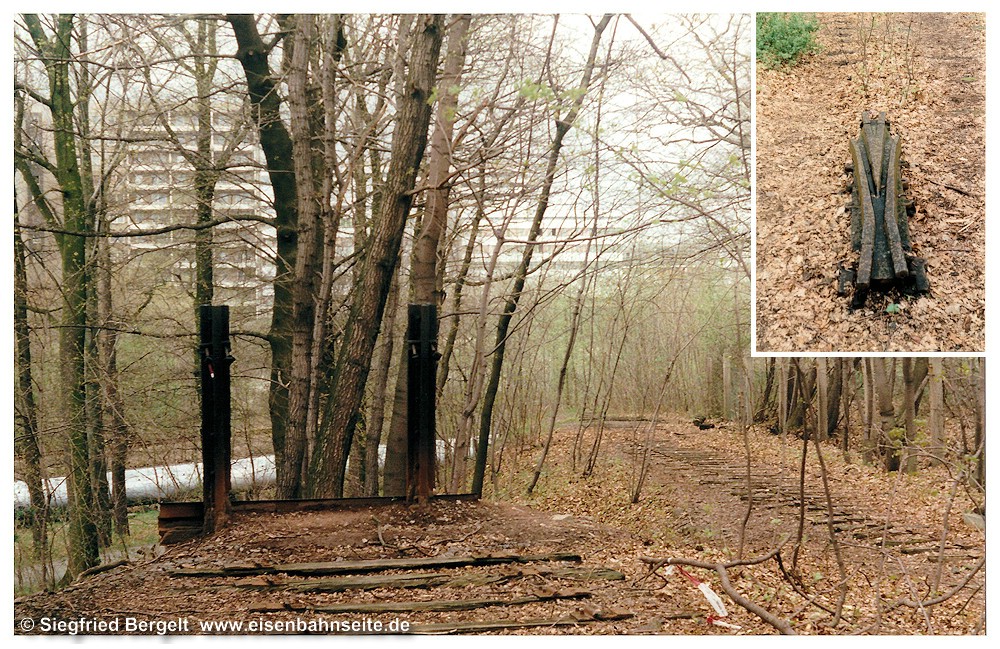 [41] Die Zugspitze der Übergabe nach Altendorf befindet sich in Höhe der einstigen Anschlussweiche zum Krankenhaus Küchwald. Im April 1996 wird offenbar gerade der Oberbau erneuert. Die Weiche war aber damals schon seit 24 Jahren ausgebaut.[42] Im Frühjahr 1997 existierten noch viele Relikte des Krankenhaus-Anschlusses. Links endete das Schutzgleis am Prellbock, während rechts die Trasse zur Strecke verläuft. Das Streckengleis erkennt man links oberhalb der Fernwärmeleitung, welche den Bahndamm des Anschlusses unterbricht. Von den beiden Weichen lag noch ein Herzstück (kleines Bild).[43] 1999 wichen diese Reste einer neuen Straßenverbindung zwischen Bürgerstraße und Flemmingstraße für Krankentransporte. Ungefähr in Lage des Schutzgleises führt die Neubaustraße anschließend auf einer Betonbrücke über die CWd.