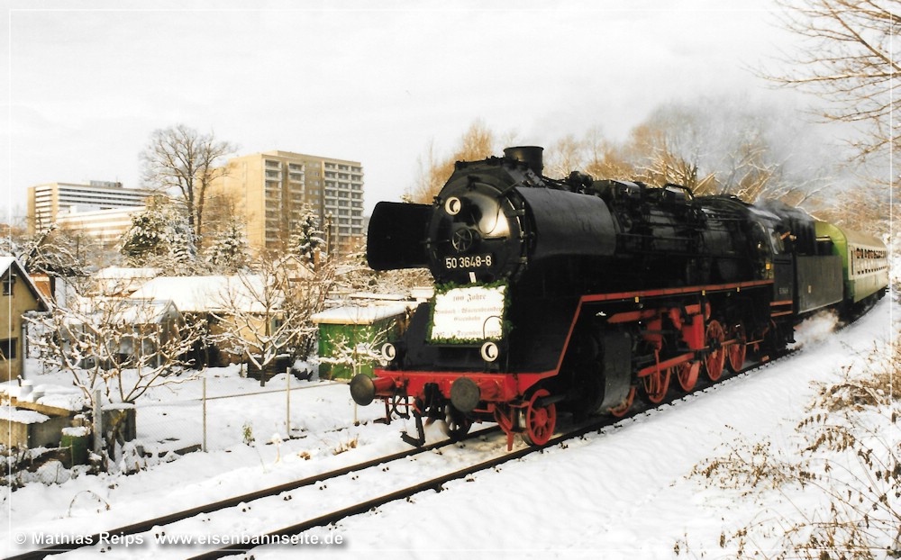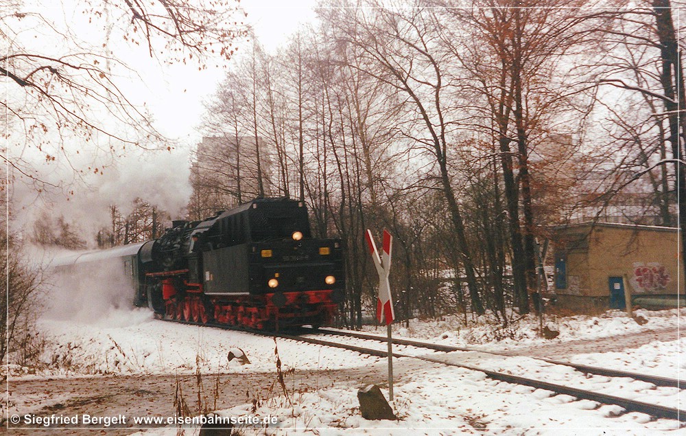 [44] Der Gleiskörper samt Bahnübergang und Beschilderung im April 2006, Blickrichtung Küchwald.[45] Eine ähnliche Perspektive im Februar 2018. Die Natur gewährt nur noch einen schmalen „Trampelpfad“.[46] Die Dampfsonderreisezüge anlässlich 100 Jahre LWd-Linie am ersten Dezemberwochenende 1997 sind sicher vielen Eisenbahnfreunden noch in guter Erinnerung. Bei schönem Winterwetter erwartete Mathias Reips den Zug nach Wüstenbrand am Bahnübergang unweit des Schrebergartens seiner Eltern/Großeltern. Links im Hintergrund ist das Neubaukrankenhaus an der Flemmingstraße erkennbar.[47] Das Krankenhaus erhielt in den 2000er-Jahren einen gläsernen Anbau am Südgiebel. Auch das Schwesternwohnheim zeigt sich rekonstruiert.