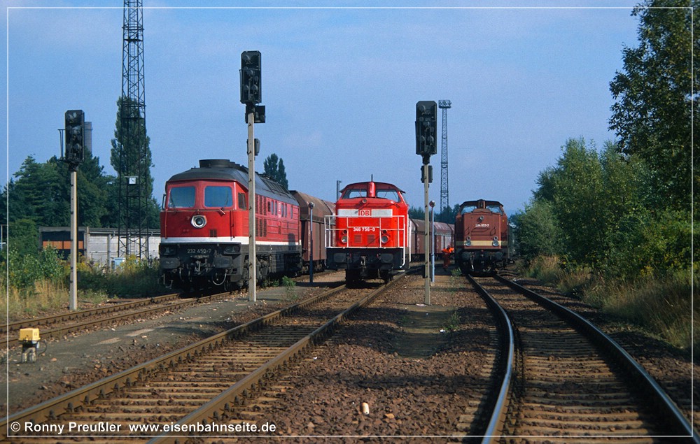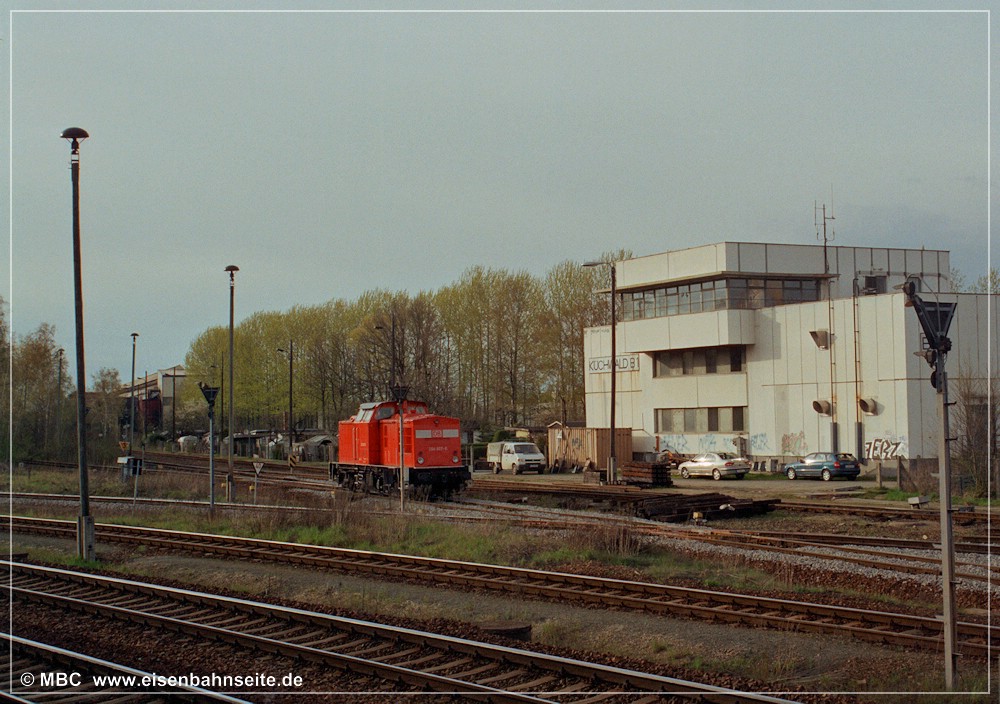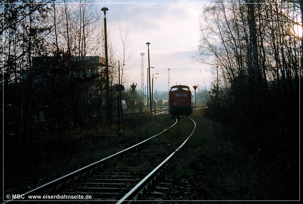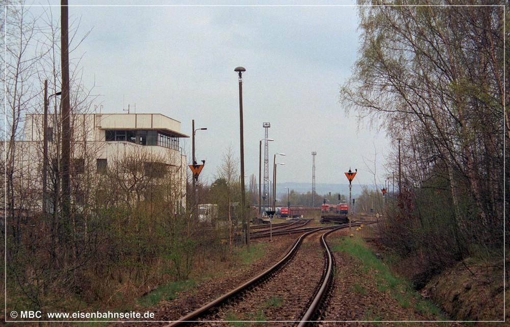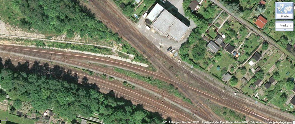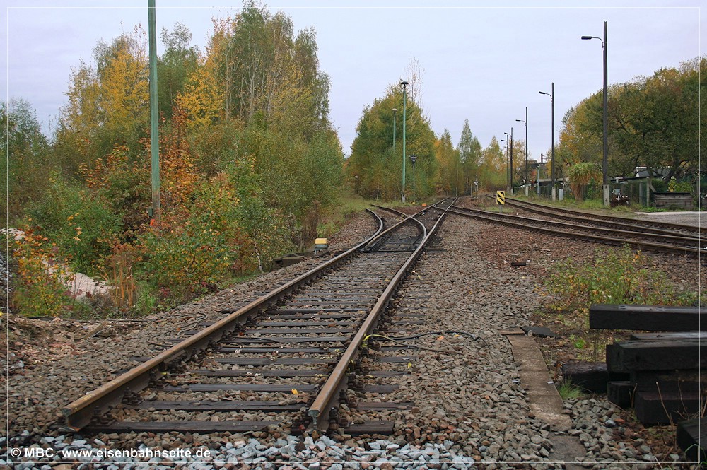 [1] Starten wir unsere Reise von Küchwald über Chemnitz-Altendorf nach Wüstenbrand mit einer standesgemäßen Parade: 232 450 wartet mit dem leeren Kohlependel gen Wüstenbrand auf Ausfahrt, 346 756 erholt sich vom Übergabeverkehr und 204 857 hat einen Hilfszug zur Rettung einer entgleisten Baumaschine hinter sich. Planmäßig kam die 204 seinerzeit als Schublok am Gips auf die Strecke. Die heute bei MTEG/PRESS existente 346 756 ist eine Zweitbesetzung, das Original fiel dem Schneidbrenner zum Opfer.[2] Diese Draufsicht zeigt die direkte Gleisverbindung von KC/KCCh in Richtung Wüstenbrand (CWd) und Wechselburg (WbC) im Zustand von 1991 bis 2006. Drei Gleise führen links gen Geithain/Leipzig, eines nach Wüstenbrand, eines nach Wechselburg, und unmittelbar vor dem Befehlstellwerk 1 zweigt noch ein ca. 300 m langes Ausziehgleis ab.[3] Im Frühjahr 2001 zeigt sich die Gleiskreuzung in Höhe Befehlstellwerk 1 nochmals frisch saniert. Die V 100, 204 607, pausiert unmittelbar vor der Abzweigweiche nach Wüstenbrand.[4] Der Blick aus Richtung Wüstenbrand auf den Küchwald-Bahnhof im April 2002. Mit der Inbetriebnahme des neuen Stellwerks (1991) änderte sich der Gleisplan, mal wieder. Gut zu erkennen: Eine direkte Gleisverbindung zu den tiefer liegenden Gleisen der Anschlussbahn gibt es nicht mehr. Fahrstraßen nach Altendorf/Wüstenbrand waren seither nur von den drei höher liegenden Gleisen (und den drei Streckengleisen KCCh/KC weiter rechts) möglich. Wurden die Ganzzüge dennoch auf den Anschlussgleisen „tief“ bereitgestellt, waren Sägezahnfahrten in Richtung Glösa (WbC) oder Borna Hp (KC) notwendig. Dies konnte mehrmals beobachtet werden.[5] 204 605 wartet auf dem CWd-Gleis am 1. Dezember 2003. Die Abzweigweiche befand sich in km 0,58 CWd.[6] Parkende V 100 an dieser Stelle waren keine Seltenheit. Am 21. April 2006 könnte es aber das letzte Mal gewesen sein, als Lok Nr.4 der AHG (ex-DR-V 100 067) kurz auf der CWd parkte. Ein Schwellenkreuz in Höhe Rangierhalttafel (Ra 10) markiert kein Weiterkommen.[7] Am 30. Oktober 2006 war die in [2] und [3] gezeigte Gleisanbindung frisch zurückgebaut. Der Blick in Richtung Wüstenbrand/Wechselburg zeigt, auch zwischen den Weichen von CWd und WbC ist ein Stück Gleis herausgetrennt worden.[8] Am 30. Oktober 2006 war man dabei, die in [2] und [3] gezeigte Gleiskreuzung zurückzubauen. Blick in Richtung Chemnitz Hbf/-Hilbersdorf. Vom Rückbau betroffen war auch das Streckengleis der CWd km 0,0 bis 0,57 sowie das in [1] sichtbare rechte Gleis (wo 204 857 stand).[9] Von der Strecke nach Wechselburg ist noch heute ein Reststück bis Chemnitz-Glösa/-Furth als Anschlussbahn in Betrieb. 260 312 befuhr diese im Februar 2018. Die seit 10/2006 funktionslose Verbindungsweiche zur CWd/KC/KCCh ist wenige Wochen zuvor ausgebaut worden. Die Wüstenbrander Strecke verendet rechts im Nichts.
