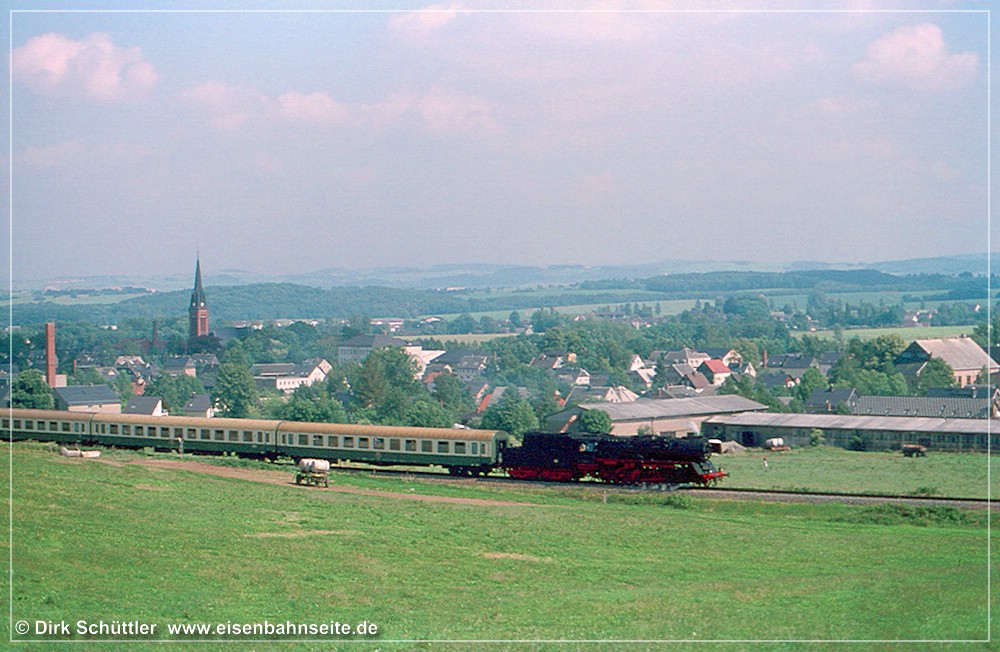 Dieser Streckenabschnitt zählte zu den landschaftlich reizvollsten. Linkerseits weitet sich das Blickfeld kurz nach dem oberen Bahnhof über die Ortschaft Grüna in das Westerzgebirge.