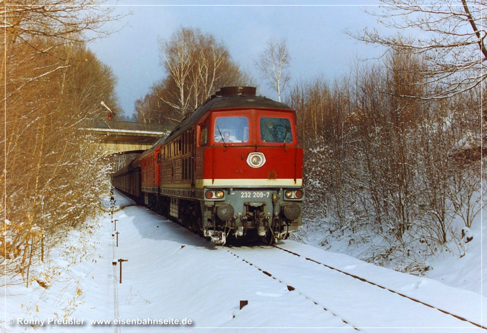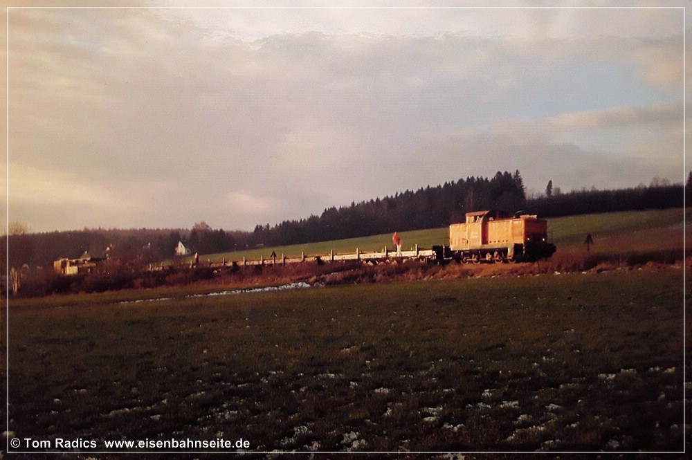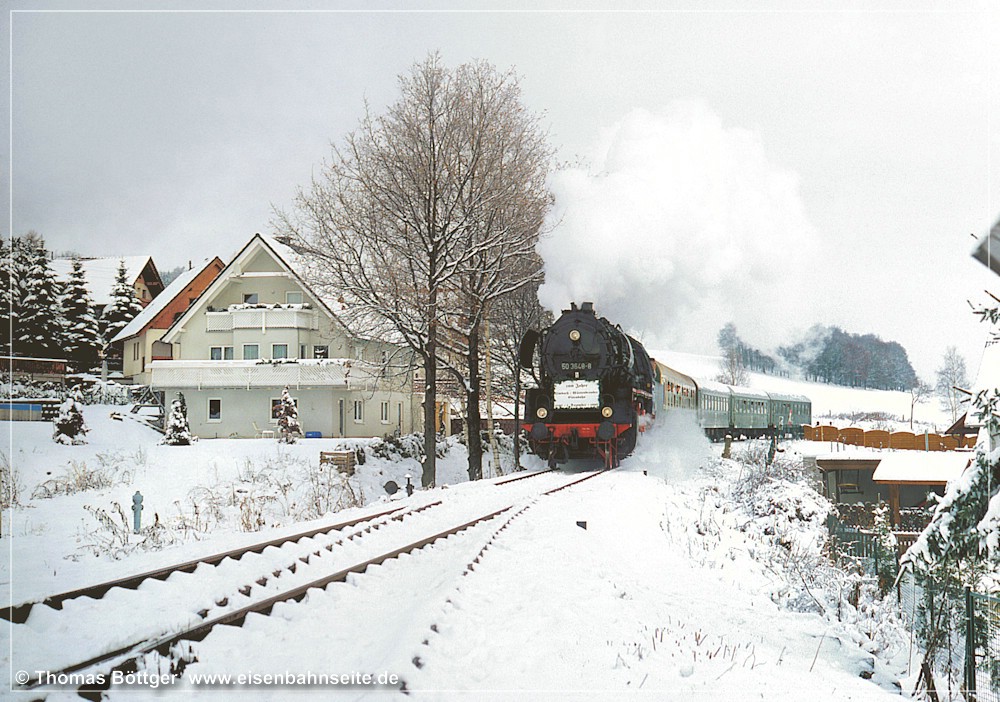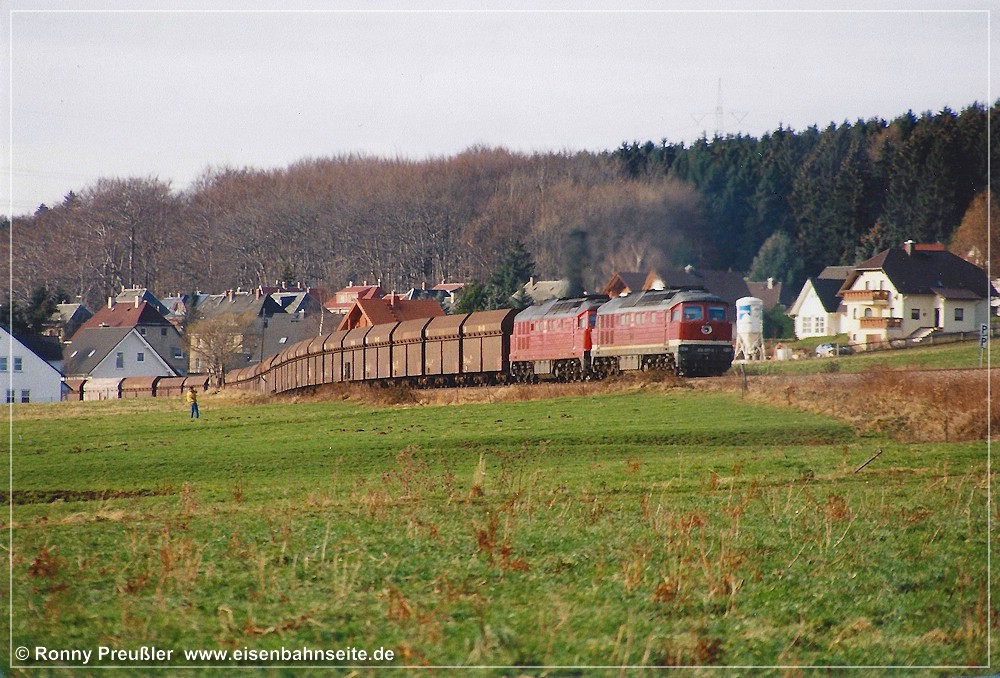 [181] Das Jubiläum 100 Jahre Zusammenschluss der Städte Hohenstein und Ernstthal wurde an einem Juniwochenende 1998 gefeiert. Die Lugauer Eisenbahnfreunde e.V. organisierten zu diesem Anlass mehrere Sonderzugpaare zwischen „Karl-Marx-Stadt“ und „Karl-May-Stadt“. Am 20. Juni 1998 rollte die Chemnitz-Hilbersdorfer 50 3648 mit dem Sonderreisezug, bestehend aus Bom-Wagen der DB AG, kurz hinter Grüna oberer Bahnhof nach Hohenstein-Ernstthal.[182] Der Blick von der anderen Gleisseite hangwärts am 17. Dezember 2003. An diesem historischen Datum befuhr letztmals ein „richtiger Zug“ die Schienen zwischen Küchwald und Wüstenbrand. Eingesammelt hat er die am 23./24. November des Vorjahres im Gleis abgelegten Schienen, die zur Streckenertüchtigung eingebaut werden sollten. Der Zug verkehrte ab Küchwald geschoben bzw. in Gegenrichtung gezogen von der V 60 D mit der LEW-Fabriknummer 12315. Die Lok erhielt ab 2002 die Nummer 106 560-6 in Zweitbesetzung.[183] Was doch alles über unsere Nebenbahn gerollt ist! Auch ein Trafo-Schwertransport konnte oberhalb von Grüna in Richtung Wüstenbrand dokumentiert werden. Im Gegensatz zu diesem Transportgut war die 232 als Zuglok hier ein alltägliches Bild in den späten 1990er-Jahren.[184] Zwischen Spätsommer 1997 und Mai 2000 leitete man die Güterzüge für das Heizkraftwerk Chemnitz-Nord II und das Großtanklager Hartmannsdorf zum größten Teil über die CWd. Die tägliche Streckennutzung war aus diesem Grund hoch wie seit Jahrzehnten nicht oder über so einen langen Zeitraum gar nie zuvor. In Verbindung mit einigen unbeschrankten Wegübergängen und folgerichtigem Signalton der Lokführer führte dies zu zahlreichen Anwohnerprotesten, u. a. in den Grünaer Neubausiedlungen. Vielen, die ihr Eigenheim jüngst neben dem Gleis platziert haben, hatte man wohl eine „tote Bahn“ versprochen. Entsprechend groß war der Verdruss. Knapp drei Jahre schlängelten sich die Ganzzüge davon relativ unbeeindruckt zwischen den Neubauten hindurch. Das Foto von Ronny Preußler, das einen Kohlenzug mit zwei 232ern zeigt, der soeben Illings Weg passiert hat und nun in Richtung oberer Bahnhof beschleunigt, schildert die Umstände ungemein eindrucksvoll.