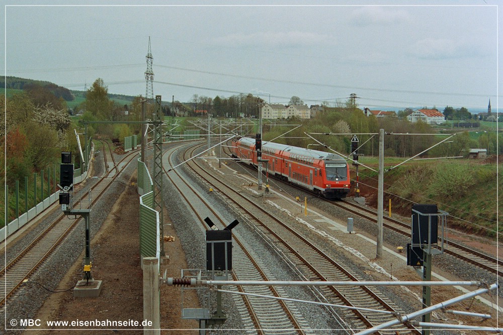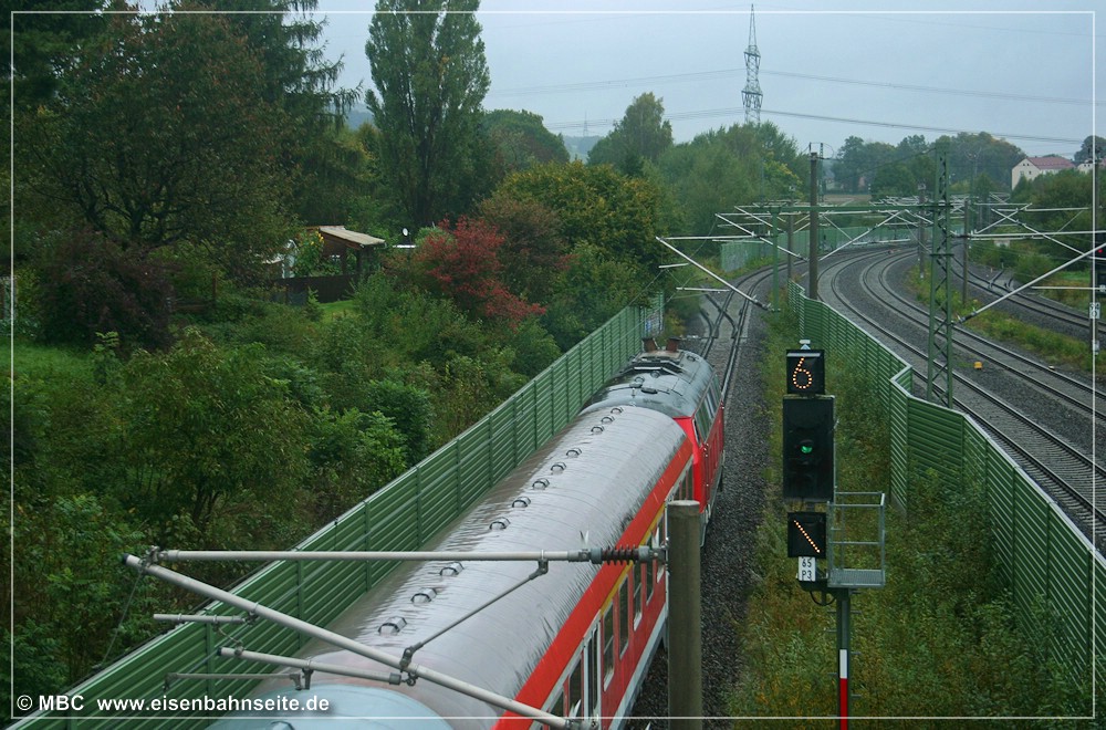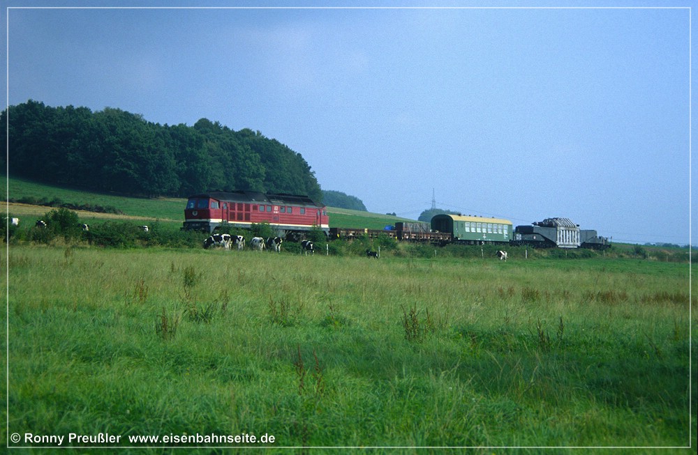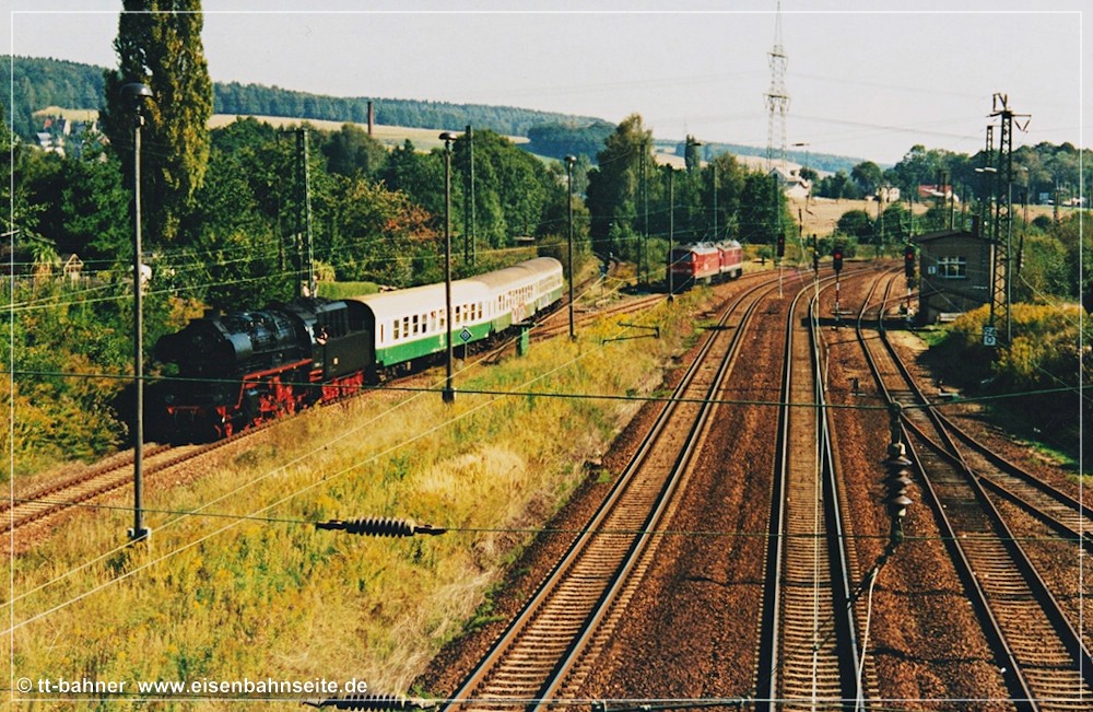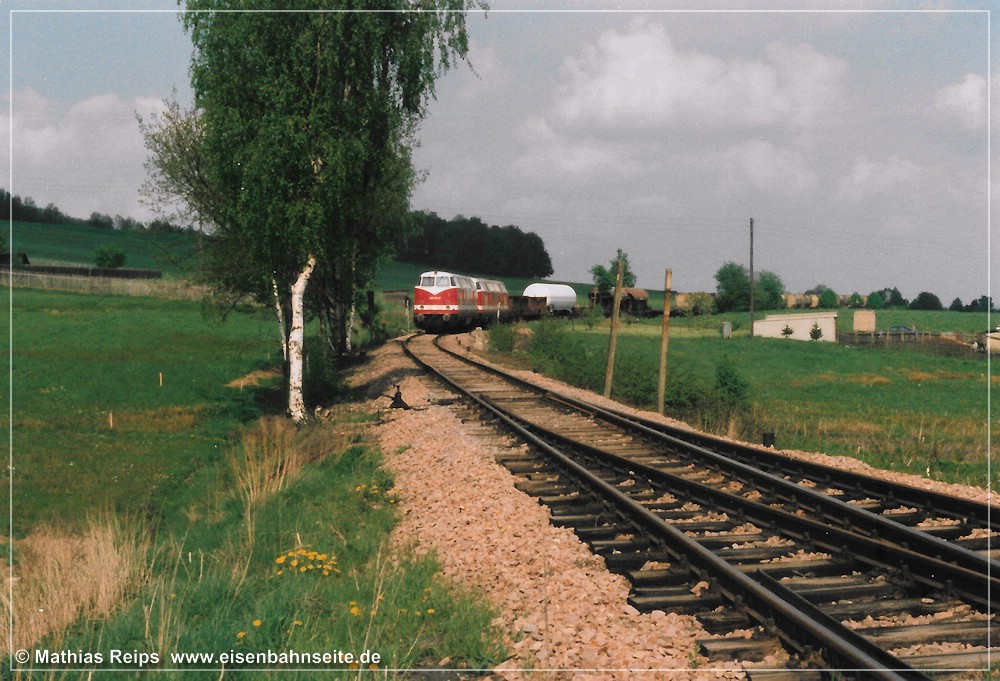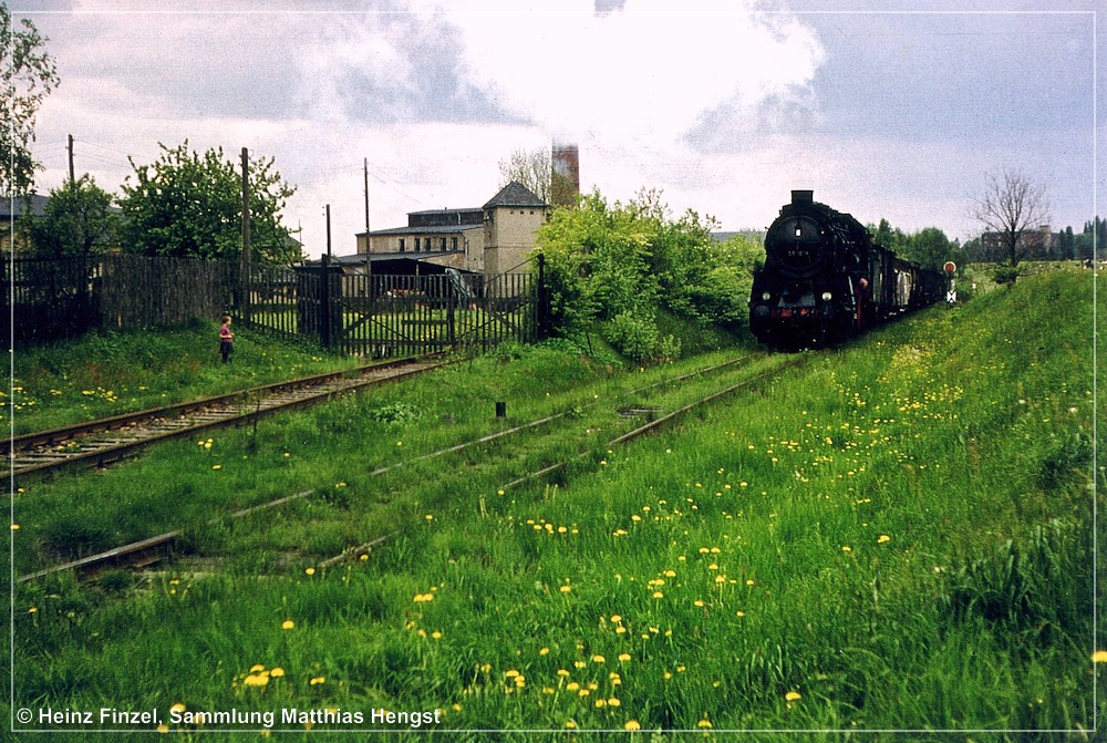 In bewegten Bildern hat Daniel Unger alias „Russpeter“ diese Szene verewigt: Kohlezug bei Grüna oberer Bahnhof – YouTube. [Wie mir erst beim Erstellen dieses Beitrages bewusst wurde, scheint es sich tatsächlich bei Bild 184 und im soeben verlinkten Video um denselben Zug zu handeln. Eine filmende Person ist deutlich erkennbar.] Das Dröhnen der 232-Doppeltraktion, insbesondere bei den damals noch weit verbreiteten Exemplaren mit „alten Lüftern“, ist für die meisten Eisenbahnfreunde wohltuende Musik, aber für andere … Man male sich die Dimensionen der „Stuhlgewitter“ (neudeutsch: Shitstorms) aus, die über die Bahn hereinbrechen würden, hätte man anno 2022 wieder solch einen Bahnverkehr durch das obere Grüna geleitet.