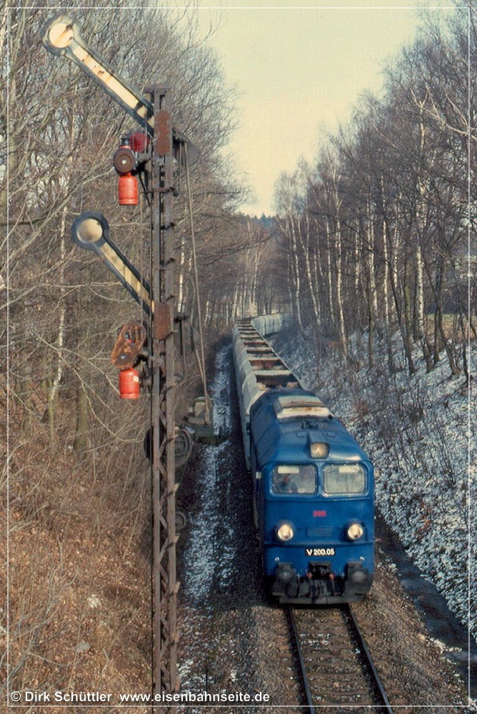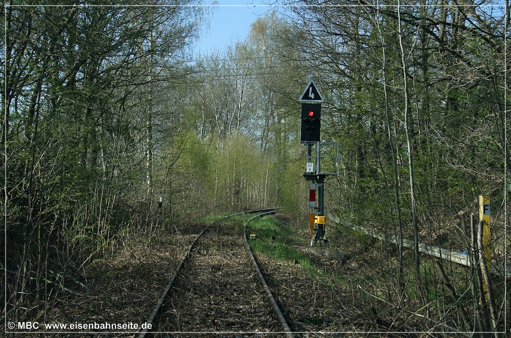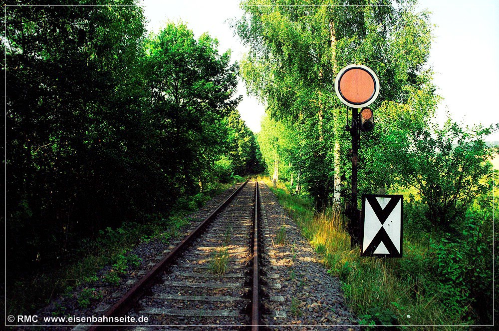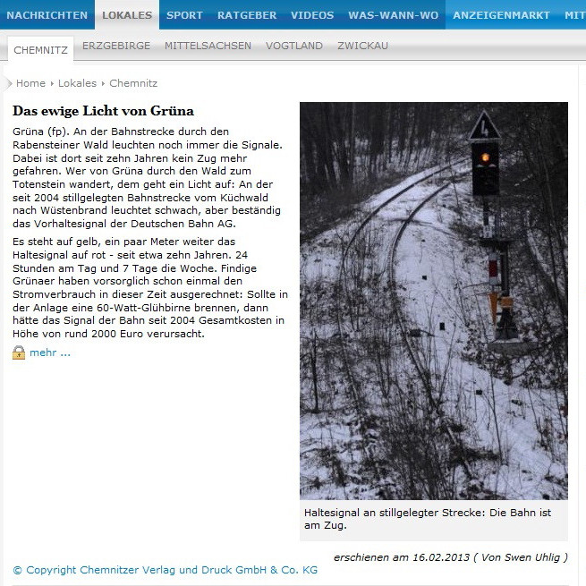 [195] Auch das Einfahrsignal Wüstenbrands war bis 2001 als Formsignal ausgeführt. Es war eines der ältesten noch aktiven seiner Art, wie sich an Details erkennen lässt. Nicht minder rar waren Einsätze einer M62 auf der CWd. Die in den 1990er-Jahren rasch bunter werdende Privatbahnlandschaft machte es möglich. Die Lokomotivfabrik Luhansk lieferte ab 1964 über 3000 Lokomotiven des Typs M62 an die RGW-Staaten. Bei der DDR-Reichsbahn waren 378 Lokomotiven als V 200 (ab 1970: BR 120; ab 1992: BR 220) eingeordnet worden. Die am 18. Februar 2000 testweise auf der CWd eingesetzte V 200.05 ist aber aufgrund ihrer großen Frontscheinwerfer eindeutig polnischer Herkunft. Dort sind diese Maschinen unter der Baureihenbezeichnung ST44 geführt worden. Im deutschen Volksmund haben sich hingegen die Spitznamen Taigatrommel und Wumme für die bulligen Sechsachser eingeprägt. Hinter V 200.05 verbarg sich die 1979 an die Polnische Staatsbahn (PKP) gelieferte ST44-844. Sie stand seinerzeit in Diensten der Prignitzer Eisenbahn GmbH.[196] Bei dieser am 29. September 2001 entstandenen Aufnahme wird die Nähe zwischen Brückengeländer und Einfahrsignal B nochmals deutlich. In der Nacht vom 6. auf den 7. Oktober 2001 schaltete man das Elektronische Stellwerk in Wüstenbrand zu und die alten Signale verloren ihre Daseinsberechtigung. Doch sowohl das Einfahr- wie auch das Einfahrvorsignal der CWd blieben bis heute erhalten. Sie befinden sich in einem Privatgrundstück in Adorf (Erzgeb).[197] Freie Einfahrt in Wüstenbrand für einen weiteren Leerzug in das Leipziger Braunkohlerevier. Die vorgespannte 232 209-7 ist im Jahr 2022 noch für DB Cargo aktiv. Links sind die Drahtzugleitungen der mechanischen Stellwerkstechnik zu sehen, welche die Signale steuerte.[198] Das 2001/2002 installierte Einfahrsignal, ein Ks, befand sich diesseits der Straßenbrücke. Am 3. Dezember 2006 wirkte die moderne Technik deplatziert. Das Gleis ist unter der Vegetation kaum auszumachen.[199] Die folgenden Aufnahmen entstanden am 25. April 2010. Kurz zuvor stellte DB Netz einen Prellbock unterhalb der Straßenbrücke auf. Dieser wurde auf dem Schienenweg, vermutlich mittels SKL, hierher transportiert. Das Gleis musste zuvor freigeschnitten werden. Groteskerweise drehte man diesen Prellbock im September 2014, als man die Signale und die Abzweigweiche demontierte, um 180 Grad.[200] Das „ewige Rotlicht von Grüna“. Im Bogen befand sich ordentlich Sand auf den Schienenköpfen.[201] Freie Presse vom 16. Februar 2013: „Findige Grünaer …“[202] Die Einmündung der CWd-/LWd- in die DW-Linie ist erreicht. Das Schwellenkreuz und die Sh 2-Scheibe verweisen auf die Betriebsruhe. Auf den Schienenköpfen sind noch deutliche Nutzungsspuren erkennbar, siehe [199].