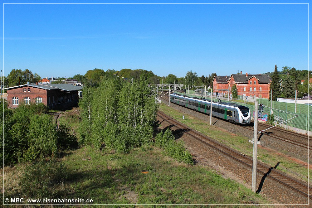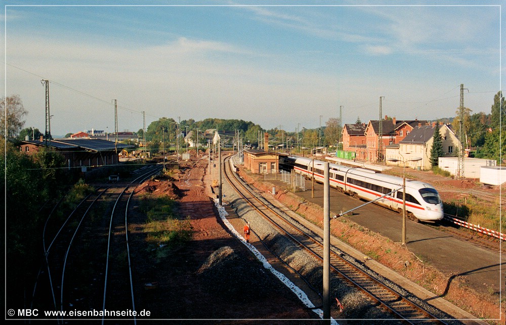 [203] Am 12. September 1999 führte 50 3648 nochmals einen Sonderzug über die CWd, nach Lugau. Der Train passiert die Abzweigweiche. Das 232-Pärchen wartet unterdessen auf die Streckenfreigabe, um die Fahrt nach Küchwald anzutreten. Mit der Auflassung des Bf Chemnitz-Altendorf im Dezember 1992 waren Zugkreuzungen auf der Strecke nicht mehr möglich, vom Einschließen in der Awanst abgesehen. Rechts ist die von der DW abzweigende Verbindungskurve in Richtung Lugau zu sehen. Ursprünglich konnten Züge aus Richtung Küchwald/Limbach hier das Gleisfeld queren, um direkt nach Lugau/Höhlteich zu gelangen. Die Anbindung an die Lugau-Oelsnitzer Kohlevorkommen war eines der Hauptmotive für den Bau der LWd. Das über die DW geplante Überführungsbauwerk verwarf man beim Bau der LWd letztlich. Die direkte Gleisverbindung beseitigte man Mitte der 1930er-Jahre, da sie den stark gestiegenen Verkehr auf der Hauptstrecke behinderte (vgl. Schilde 1997, S.22).[204] Im April 2002 war lediglich die modernisierte Südhälfte des Bf Wüstenbrand in Betrieb. Die Nordhälfte mit der Anbindung unserer CWd zeigt sich nahezu fertiggestellt. Die Einbindung der Industriebahn in das Elektronische Stellwerk war nicht billig. Alles deutete 2002 auf eine zukünftige Nutzung hin. Doch es kam bekanntlich anders. Das in [203] erkennbare Stellwerk W1 ist kurz nach dessen Außerbetriebnahme abgebrochen worden. Auch die Verbindungskurve aus Richtung Chemnitz gen Lugau existiert nicht mehr.[205] Der Blick von der Brückenstraße auf die Abzweigweiche mit dem Teleobjektiv im Juli 2004.[206] Die Weiche stand natürlich am 26. September 2010 nicht auf Abzweig als 218 430 mit ihren beiden Reisezugwagen Wüstenbrand gen Osten verließ. Der Leerreisezug sollte nach Zwickau und mit Fußballfans weiter nach Aue verkehren. Doch während der Fahrt wurde der Spielausfall bekanntgegeben, sodass kurzfristig in Wüstenbrand am Hausbahnsteig Kopf gemacht und die Rückfahrt nach Chemnitz angetreten wurde.[207] Ende September 2014 hatte man den Fehler der Geschichte behoben und die Anbindung der CWd in Wüstenbrand vollständig beseitigt. Am 30. April 2020 geht es auch dem Streckengleis an den Kragen. Das Abbaugerät war soeben eingetroffen.[208] Nun blicken wir westwärts von der SÜ Brückenstraße. Am 29. September 2001 zeigt sich bereits vieles für die ESTW-Anbindung umgeackert. In diesem Zeitraum waren die ICE TD (BR 605) planmäßig zwischen Nürnberg und Dresden im Einsatz. Dieses Kapitel währte nur rund zwei Jahre. Links sind der Güterschuppen, in Bildmitte der Sitz des Fahrdienstleiters und rechts das 1899 errichtete Empfangsgebäude in der seinerzeit vorherrschenden Klinkerbauweise zu sehen. Die beigen Gebäude rechts daneben beherbergten u. a. Wohnungen und die Signal- und Fernmeldemeisterei.[209] Der Zustand Mitte 2020: Der GS zeigt sich in gutem Zustand, hingegen verfällt das leerstehende Empfangsgebäude zusehends. Die Gebäude rechts davon brach man 2016 ab. Auch im Bahnhofsbereich scheinen Schallschutzwände erforderlich zu sein.[210] Der Gipszug ist im Vergleich zu den Kohlezügen relativ selten auf der CWd festgehalten worden, denn er fährt nur in der Winterzeit, meist einmal pro Woche. Im Gegensatz zu den meisten anderen umgeleiteten Zügen fuhr er beladen ab Küchwald. Das bedeutete Grenzlast auf der CWd! Am 28. Dezember 1998 hat 232 002 mit dem Gipszug den Hausbahnsteig in Wüstenbrand erreicht und wartet auf die Weiterfahrt in Richtung Glauchau. Planmäßig schob bis hierhin eine Lok der BR 204 nach, diese ist am Zugschluss deutlich erkennbar. Das links sichtbare, hölzerne Bahnsteigdach fiel der Modernisierung 2001 zum Opfer. Das repräsentative Empfangsgebäude entstand 1899 bis 1900 im Zuge einer Bahnhofserweiterung. Heute steht es leer und hinterlässt einen traurigen Eindruck. Droht ihm dasselbe Schicksal wie im Jahr 2007 dem EG im benachbarten Hohenstein-Ernstthal? In Stollberg (Sachs) sieht man, wie es besser gehen könnte.