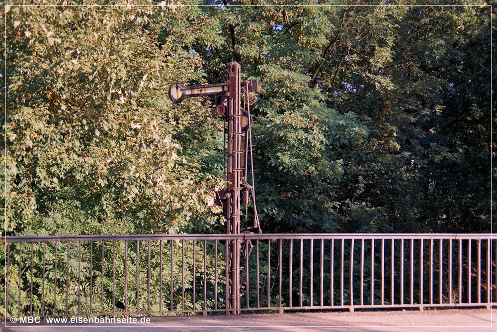 [191] Der Blick vom Führerstand der 110 080-9 während einer Bedienung des Anschlusses Hechelei zirka 1990. Ein Gbs-Wagen wurde zugestellt.[192] Am 23. November 2006 waren die Anschlussgleise teilweise noch vorhanden.[193] Das Einfahrvorsignal respektive „Spiegelei“ des Bf Wüstenbrand aus der Nähe am 14. August 2001. Noch knapp zwei Monate übt es seine Funktion aus, wird sich dafür aber kaum noch bewegen müssen. Schließlich endete der planmäßige Zugverkehr bereits am 27. Mai 2000.[194] Das neue Einfahrvorsignal ist ein modernes Kombinationssignal. Es stand einige Streckenmeter weiter in Richtung Wüstenbrand als sein Vorgänger. Links sind die Anlagen der Hechelei ersichtlich. Während das Signal rund ein Jahrzehnt nach seiner Aufstellung makellos wirkt, zeigt sich das Gleis am 11. Dezember 2011 verwildert.