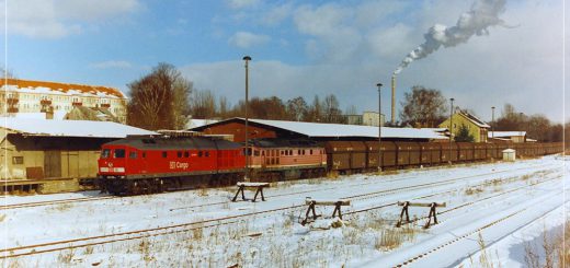 [210] Der Gipszug ist im Vergleich zu den Kohlezügen relativ selten auf der CWd festgehalten worden, denn er fährt nur in der Winterzeit, meist einmal pro Woche. Im Gegensatz zu den meisten anderen umgeleiteten Zügen fuhr er beladen ab Küchwald. Das bedeutete Grenzlast auf der CWd! Am 28. Dezember 1998 hat 232 002 mit dem Gipszug den Hausbahnsteig in Wüstenbrand erreicht und wartet auf die Weiterfahrt in Richtung Glauchau. Planmäßig schob bis hierhin eine Lok der BR 204 nach, diese ist am Zugschluss deutlich erkennbar. Das links sichtbare, hölzerne Bahnsteigdach fiel der Modernisierung 2001 zum Opfer. Das repräsentative Empfangsgebäude entstand 1899 bis 1900 im Zuge einer Bahnhofserweiterung. Heute steht es leer und hinterlässt einen traurigen Eindruck. Droht ihm dasselbe Schicksal wie im Jahr 2007 dem EG im benachbarten Hohenstein-Ernstthal? In Stollberg (Sachs) sieht man, wie es besser gehen könnte.