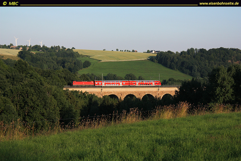 [34] Syrau, der Ort mit der Windmühle, wird von 143 883 und ihren drei Doppeldeckern durchhastet. Beim Wolkenlotto gab es immerhin vier Richtige. (8/2014)