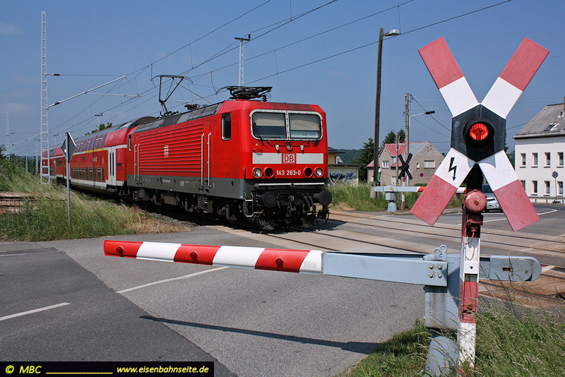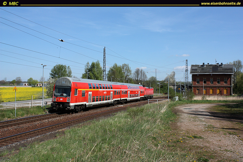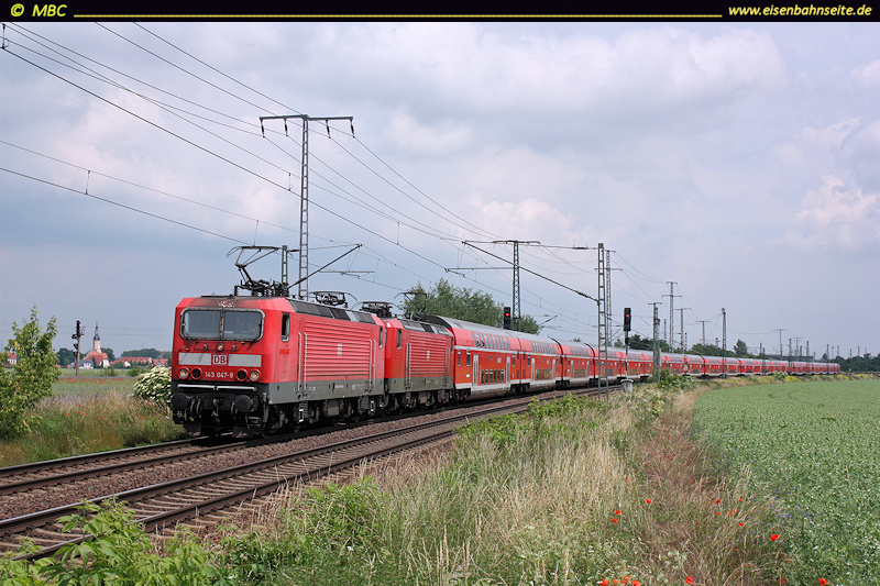 Die vielen nun überschüssigen Fahrzeuge finden teilweise neue Aufgaben. 143 047 und 816 brachten am 13.06.2016 zwanzig Doppelstockwagen (davon acht Steuerwagen) nach Karlsruhe. Sie werden sich in Freiburg und Stuttgart ihr Gnadenbrot verdienen. Wohin es die beiden Loks verschlägt, bleibt abzuwarten. Aufgenommen am Abzweig Zeithain Bogendreieck nahe Röderau.