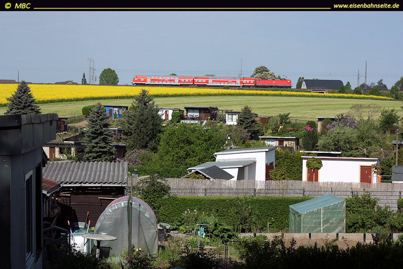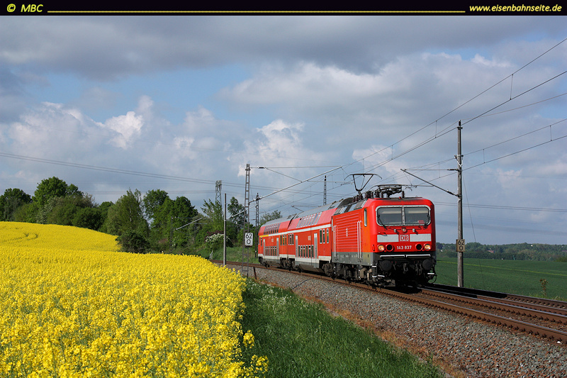 [52] Der Lackzustand der ex-Erfurter 143 837 war für Dresdner Verhältnisse überdurchschnittlich. Für das blühende Rapsfeld von Chemnitz-Ebersdorf ein toller Kontrast. Direkt in Höhe Bahnlinie verläuft an dieser Stelle die Flurgrenze von Ebersdorf und Furth. (5/2015)