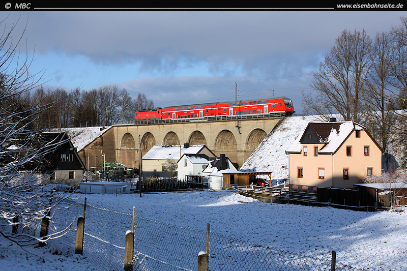 [49] Das alte Ottendorfer Viadukt wurde im Jahr 2015 durch eine Stabbogenbrücke ersetzt und abgerissen. Im Dezember 2014 war dies, zumindest aus diesem Blickwinkel, noch nicht absehbar. 143 370 schiebt.