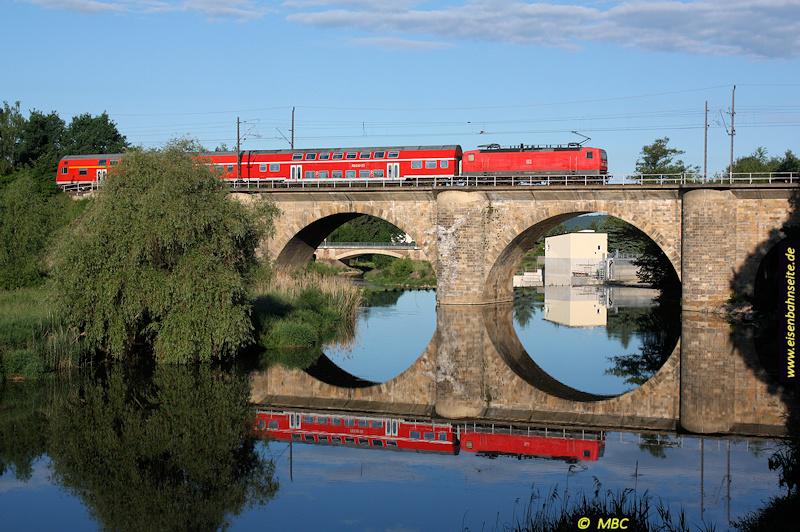 [46] Vor und nach dem Bahnhof Waldheim befinden sich markante Steinbogenbrücken. Am Nordkopf steht das Diedenmühlenviadukt, welches hier von 143 585 überquert wird. (10/2015)