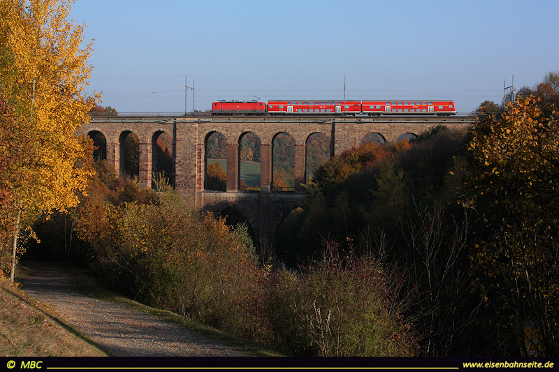 [29] Wie der zweite Teil endete, beginnt auch der dritte auf Ziegeln. Noch etwas imposanter als der „Römer“ zeigt sich das Göltzschtalviadukt, als eine unbekannte 143 mit dem RE gen Dresden darüber rollt. (2/2015)