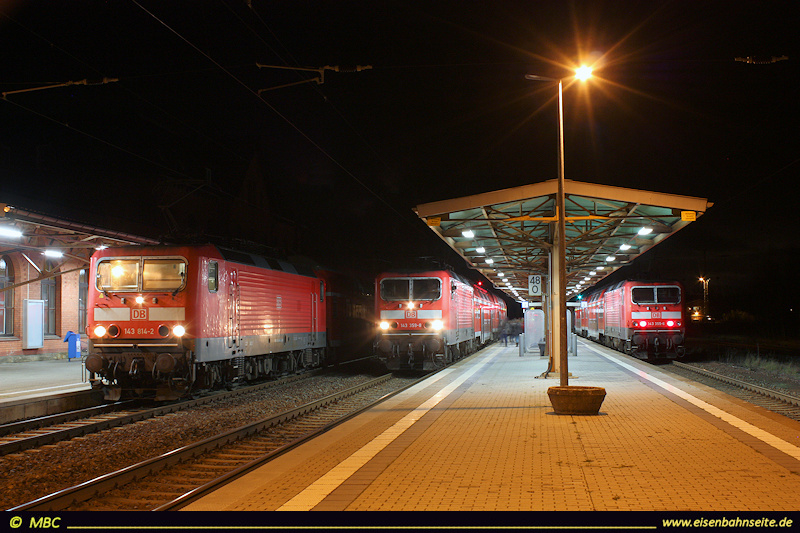 [38] Endstation Hof, oder auch Ausgangspunkt gen Dresden. Weiter kam die 143 aus eigener Kraft nie. Zur Freude des Fotografen hat man bei der Elektrifizierung an dieser Stelle auf Quertragwerke gesetzt. (1/2015)