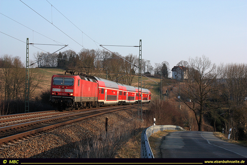 [31] Die im Frühjahr’15 aus Nürnberg nach Dresden gekommene 143 952 war dort 2008 schon einmal kurz zu Hause. Ins Vogtland kam sie damals gewiss noch nicht, Durchfahrt Liebau (3/2015).