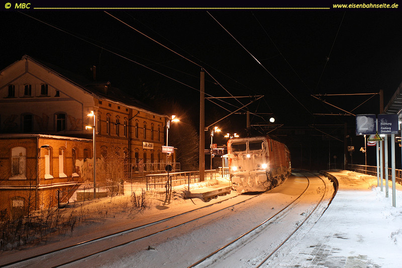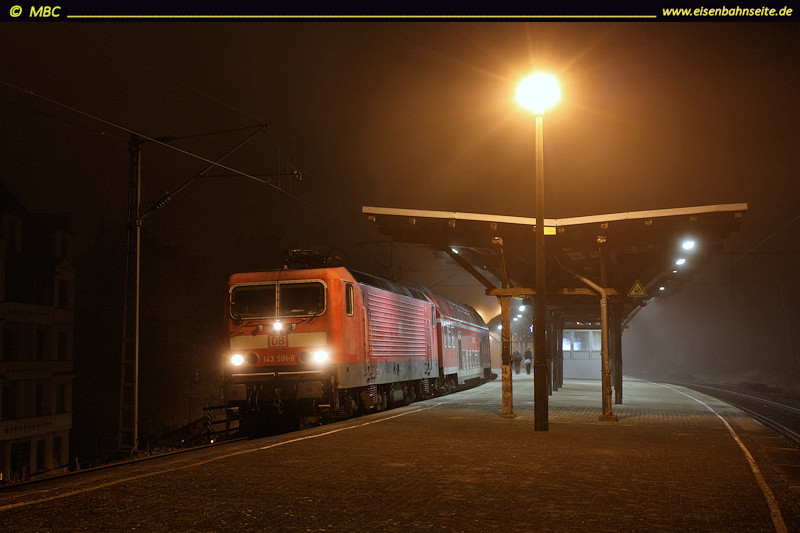 Totgesagte leben länger … aber auch nicht ewig. Der 05.01.2017 ist der vorerst letzte Einsatztag einer 143 zwischen Freiberg und Zwickau im Reisezugverkehr. Am Abend erreicht die RB 30 mit gut zehn Minuten Verspätung den Haltepunkt Chemnitz-Hilbersdorf. Hinter dem „Puderzucker“ verbirgt sich 143 591.