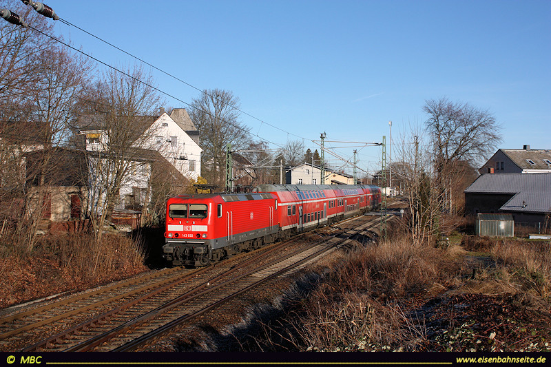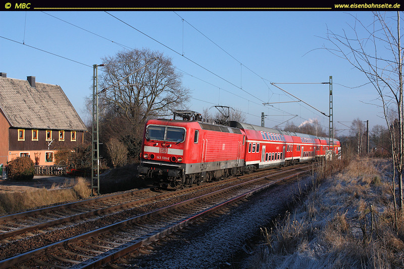 Zwischen 24.12.16 und 03.01.17 wurde 143 591 von 143 932 vor dem Doppelstockzug abgelöst. Am 30.12.16 verlässt die bestens gepflegte Lok die Station Frankenstein (Sachs) in Richtung Zwickau.