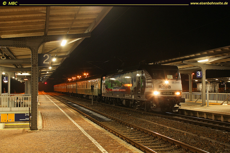 Die für die Rügensche Bäderbahn werbende 145 023 ersetzte ab 13.12. die 145 030 vor dem „Museums-RE“. Am 16.12.2016 war sie mit der Garnitur auf der letzten Runde im Regelverkehr nach Hof (RE 26988), hier beim Reisendenhalt in Flöha.