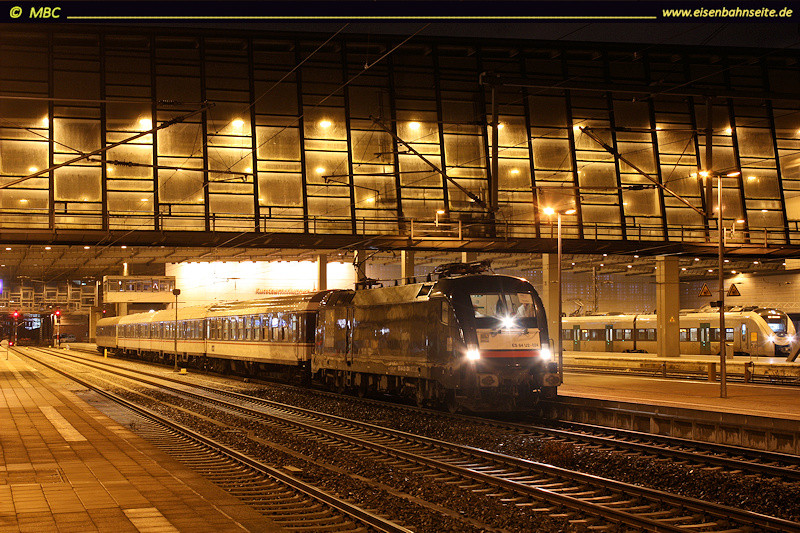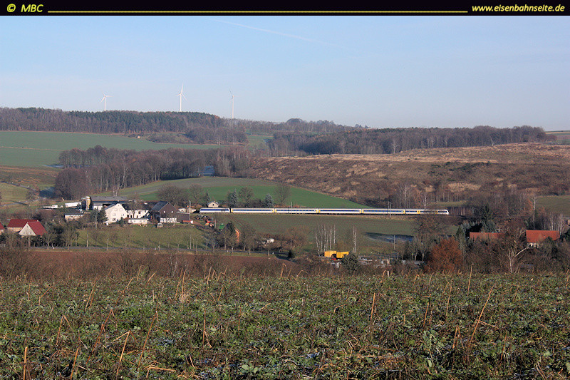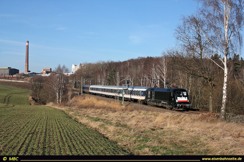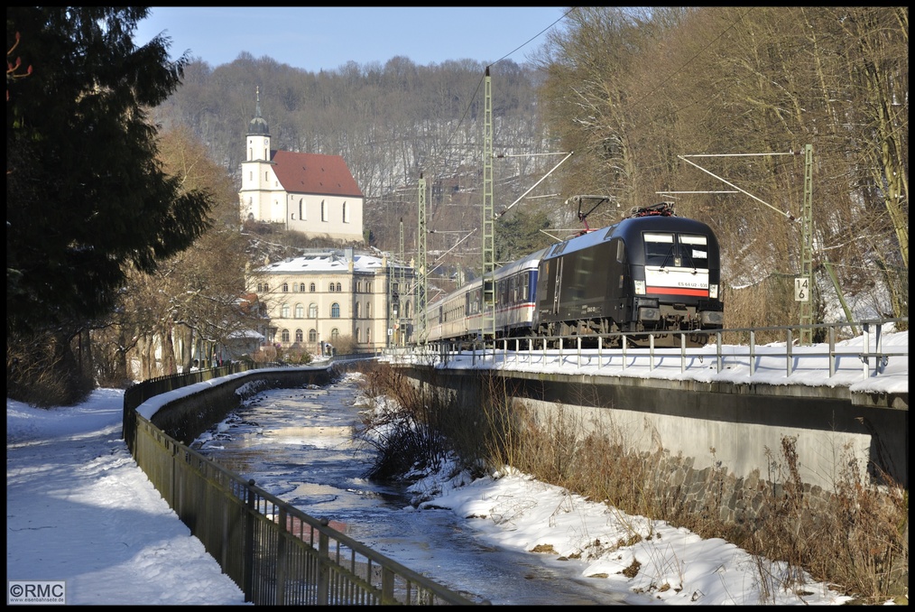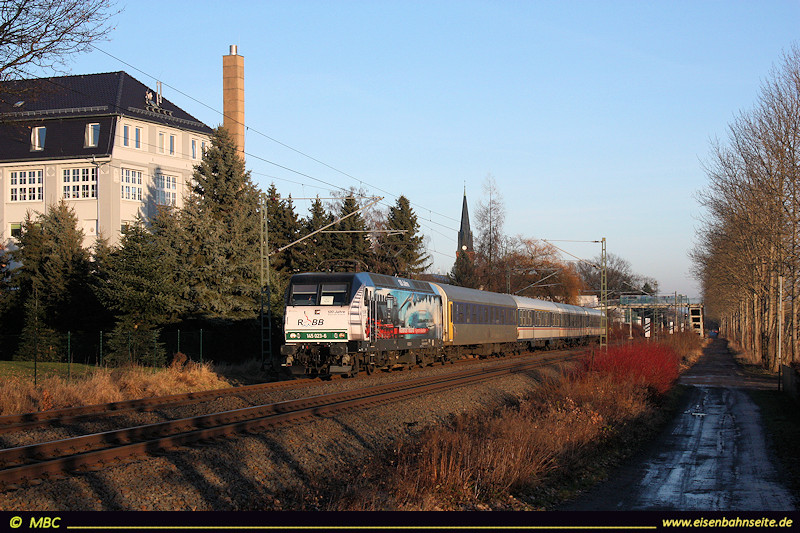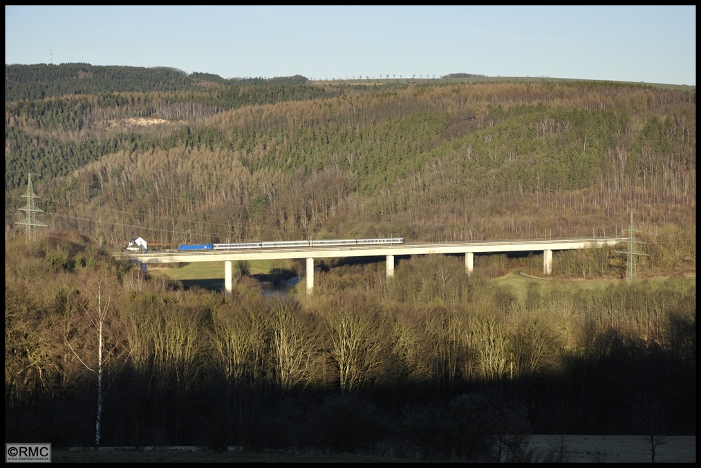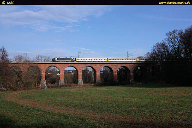 Doch dass dieser eine Zug nicht reichen würde, um die ganzen ET-Ausfälle zu kompensieren, lag nahe. Ab 10.12. ergänzten zwei weitere lokbespannte Züge das RE 3-Angebot. MRCE Dispo verlieh 182 524 und 182 530. Das Wagenmaterial stellten Tobias Richter (National-Express) und die MRB (RE 6) zur Verfügung. 182 530 zieht am 10.12. auf dem Römertalviadukt bei Steinpleis die MRB-Wendezuggarnitur nach Hof.