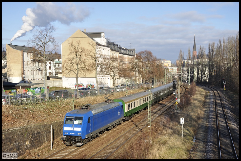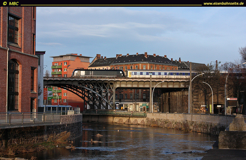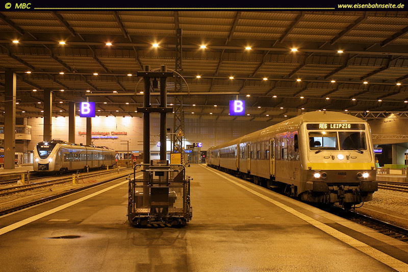 Wird das Kürzel MRB schon seit Übernahme der RE-Linie 6 von Spöttern als „Mitteldeutsche Reichsbahn“ interpretiert, so kann diese Garnitur nur Wasser auf deren Mühlen sein. Sogar ein Halbgepäckwagen (BDomsb) ermöglicht längst verloren geglaubte Reisegefühle. Dahinter drei grüne Bn-Wagen und schließlich der Bmh, so die Reihung gen Hof. Aufgenommen wurde das Ganze – wie passend – im „Reichsbahnbogen“ an der Chemnitzer Rembrandtstraße am 06.12.2016.