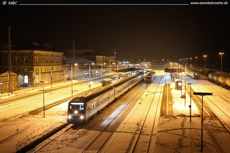Ein Bild vom Ausgangspunkt des RE 3 in Hof am Morgen des 29.01.17. Im Gegensatz zur MRB-Variante basiert dieser Steuerwagen auf einem n-Wagen der Bundesbahn, besitzt aber auch den „Wittenberger Kopf“.