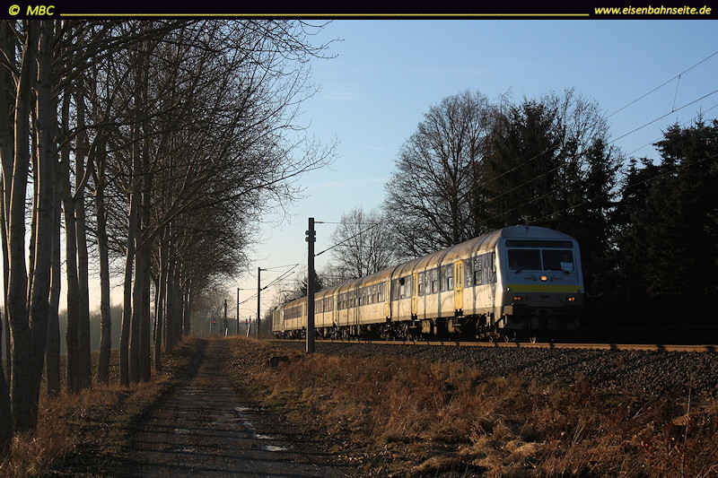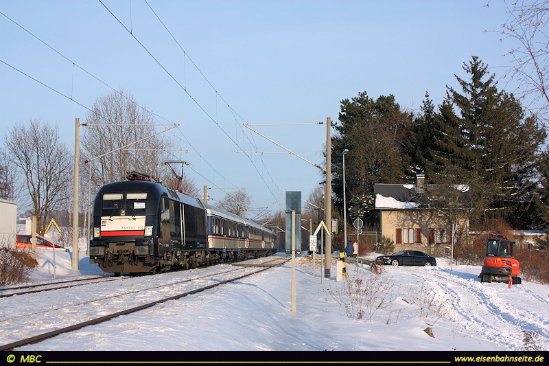 Nun bildeten die beiden 182 mit den NX-/MRB-Wagen die letzten verbliebenen Ersatzzüge. Mitte Januar kamen sie für mehrere Tage nicht zum Einsatz. Ab 26.01.17 fuhren wieder beide Züge, hier 182 530 am Bahnübergang „Nutzung“ kurz hinter Wüstenbrand.