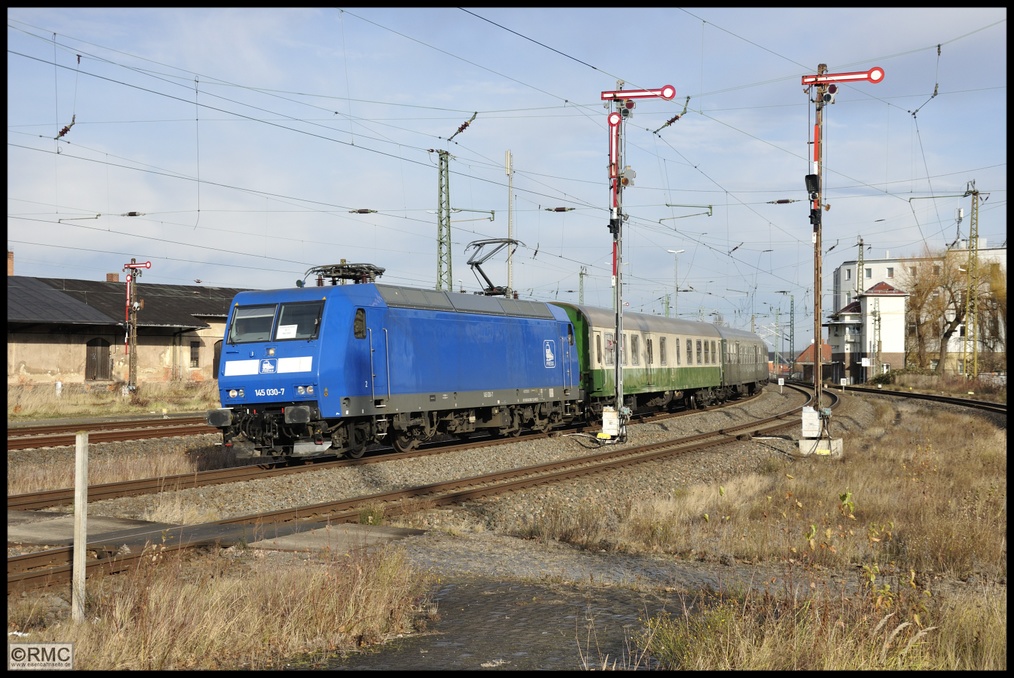 Zwei Tage später hatte man sich anderweitig beholfen. Die PRESS stellte einige ex-DB/DR-Reisezugwagen zur Verfügung. Gezogen von 145 030 ist der Zug auf seiner ersten Runde in Diensten der MRB bei Hohenstein-Ernstthal zu sehen.