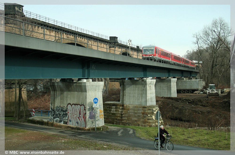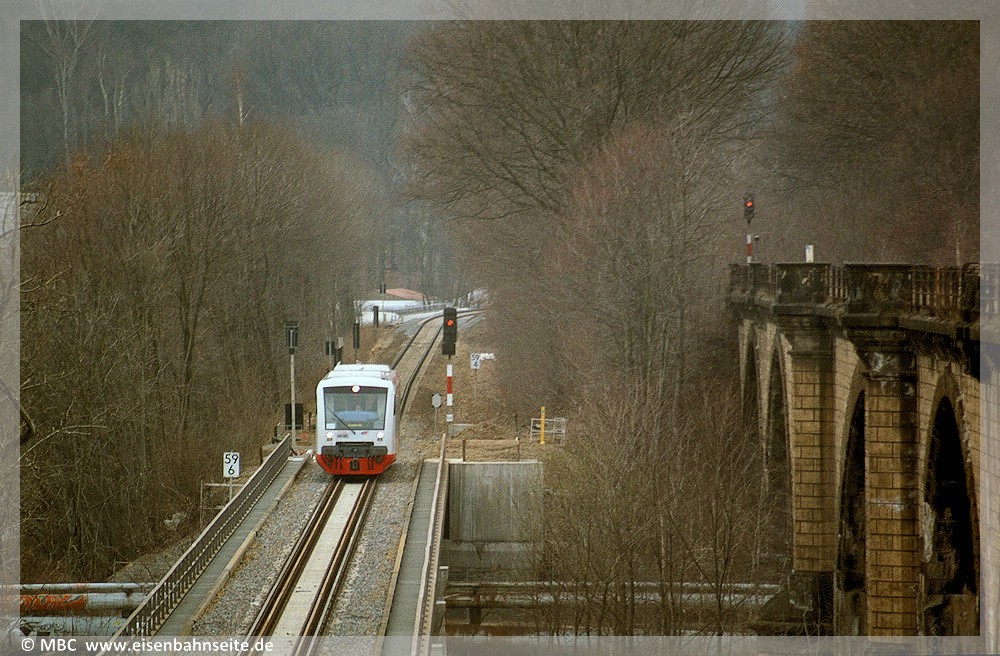[13] Ein Bild vom Ist-Zustand der „Klapperbrücke“. Die neuen (leider schon beschmierten) Pfeiler sind natürlich in der Breite schmaler ausgefallen. Am 11.02.2007 waren nochmals VT 628.4 auf der eigentlich schon von VT 612 dominierten Strecke im Einsatz (628 603 und 609).