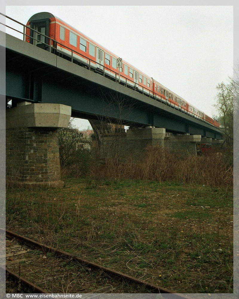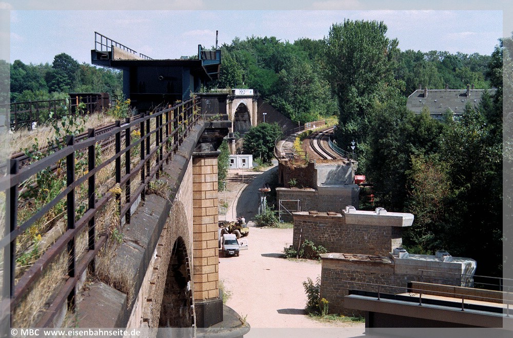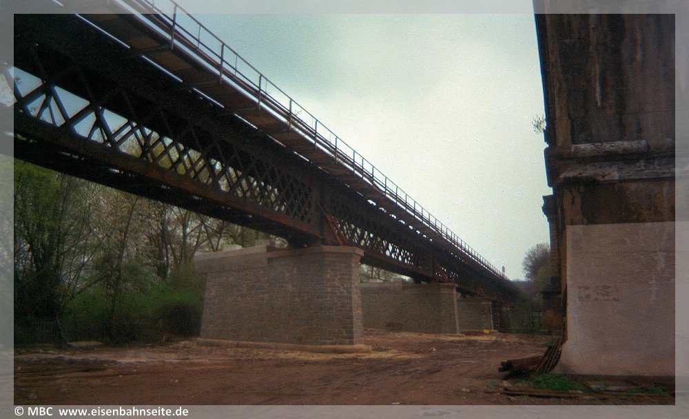 [6] Eine andere Perspektive im April 1999, Blick in Richtung Küchwald. Hier sind die alten Rautenträger zu sehen. Die ungenutzten Überbauten des ehemaligen zweiten Gleises sind bereits entfernt und die Pfeiler für die Neubauten vorbereitet.