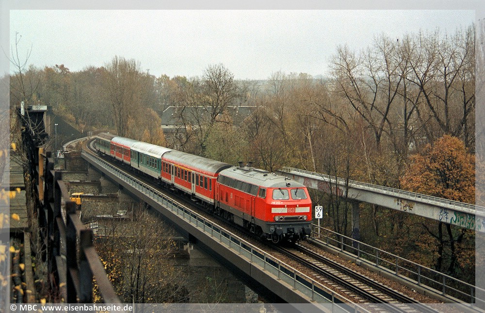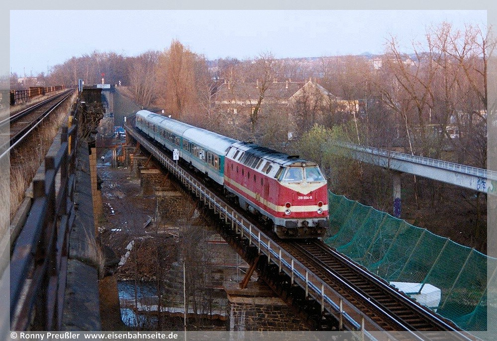 [2] Zum Jahresbeginn 1999 rollte 219 004 mit dem Regionalexpress nach Leipzig über die bereits auf Gleisbreite halbierte Klapperbrücke.